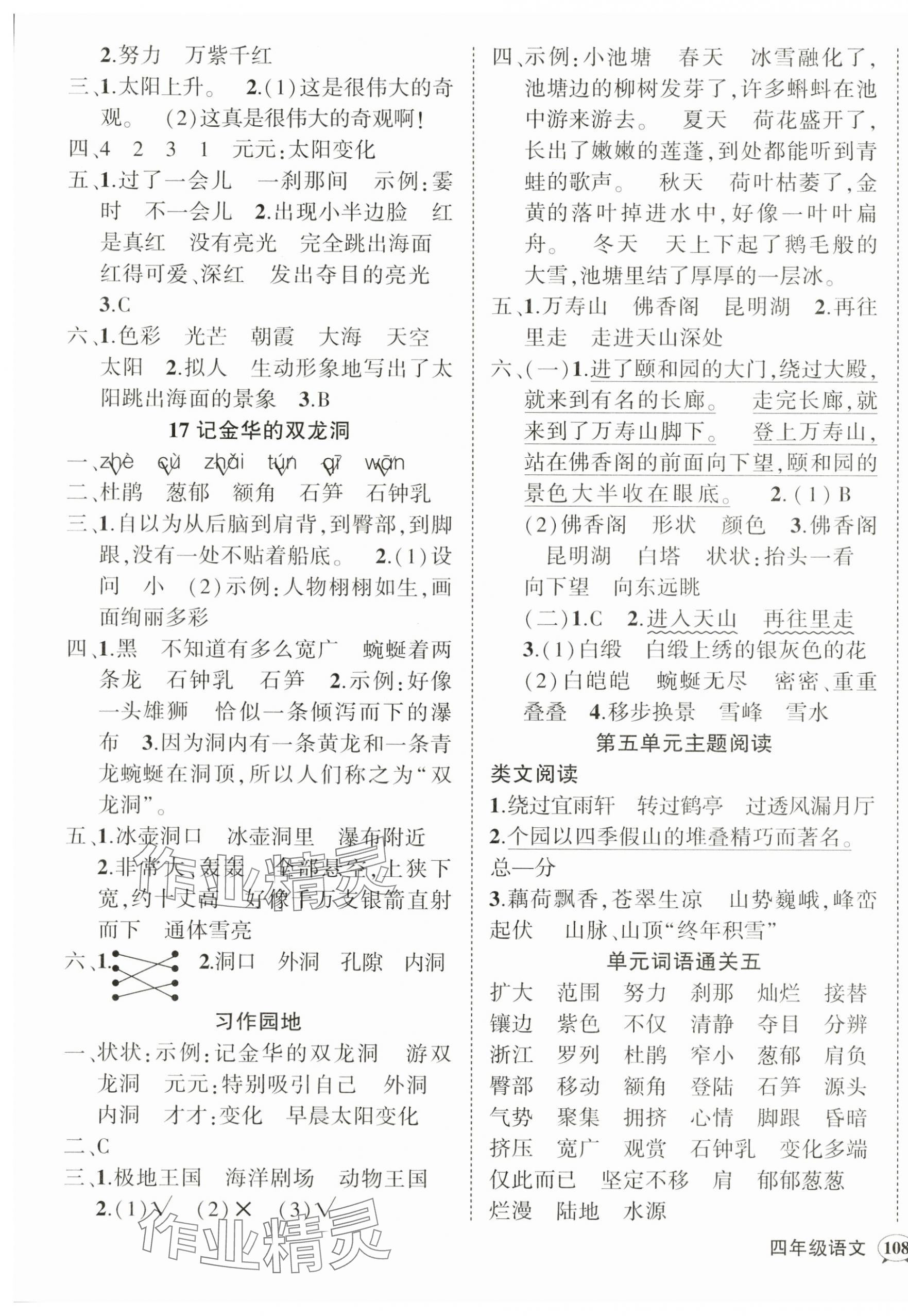 注:目前有些书本章节名称可能整理的还不是很完善,但都是按照顺序排列的,请同学们按照顺序仔细查找。练习册 2024年状元成才路创优作业100分四年级语文下册人教版广东专版 答案主要是用来给同学们做完题方便对答案用的,请勿直接抄袭。