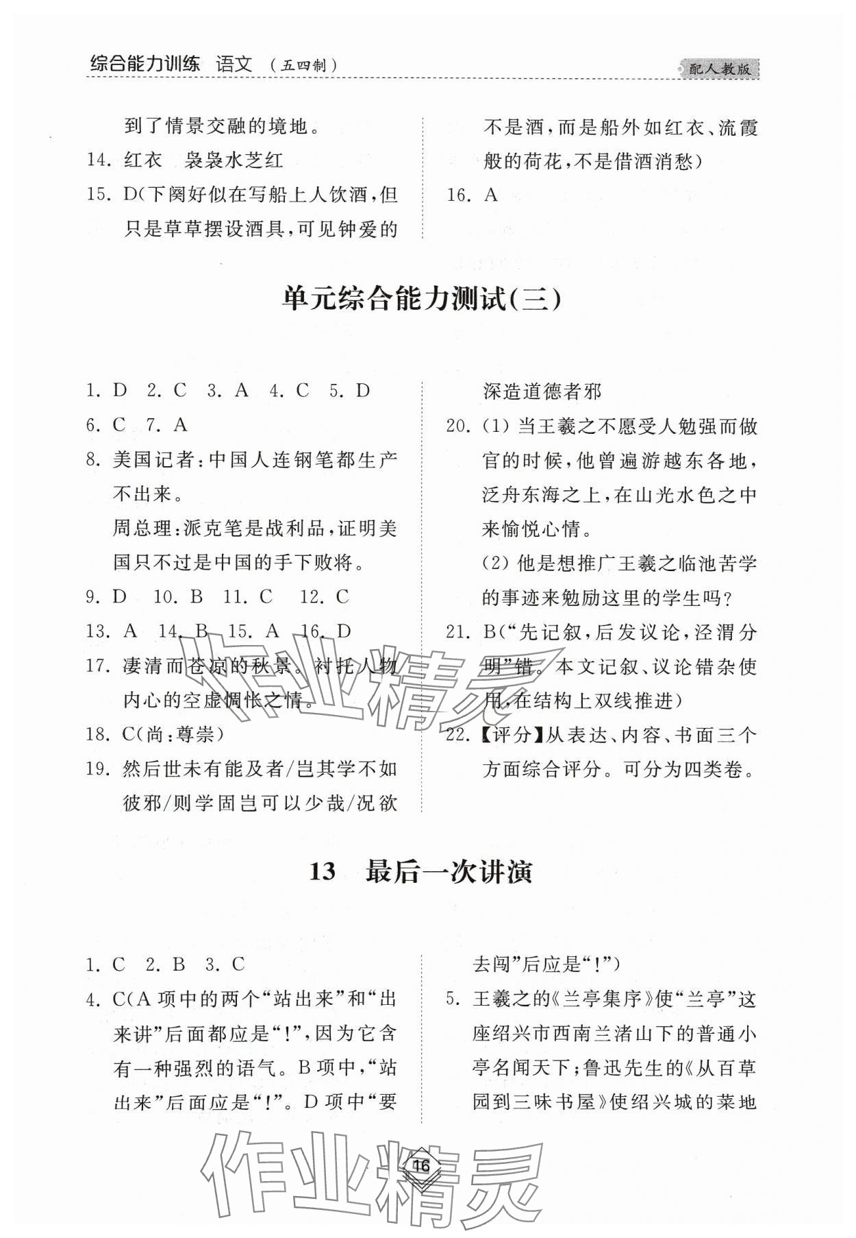注:目前有些书本章节名称可能整理的还不是很完善,但都是按照顺序排列的,请同学们按照顺序仔细查找。练习册 2024年综合能力训练八年级语文下册人教版54制 答案主要是用来给同学们做完题方便对答案用的,请勿直接抄袭。