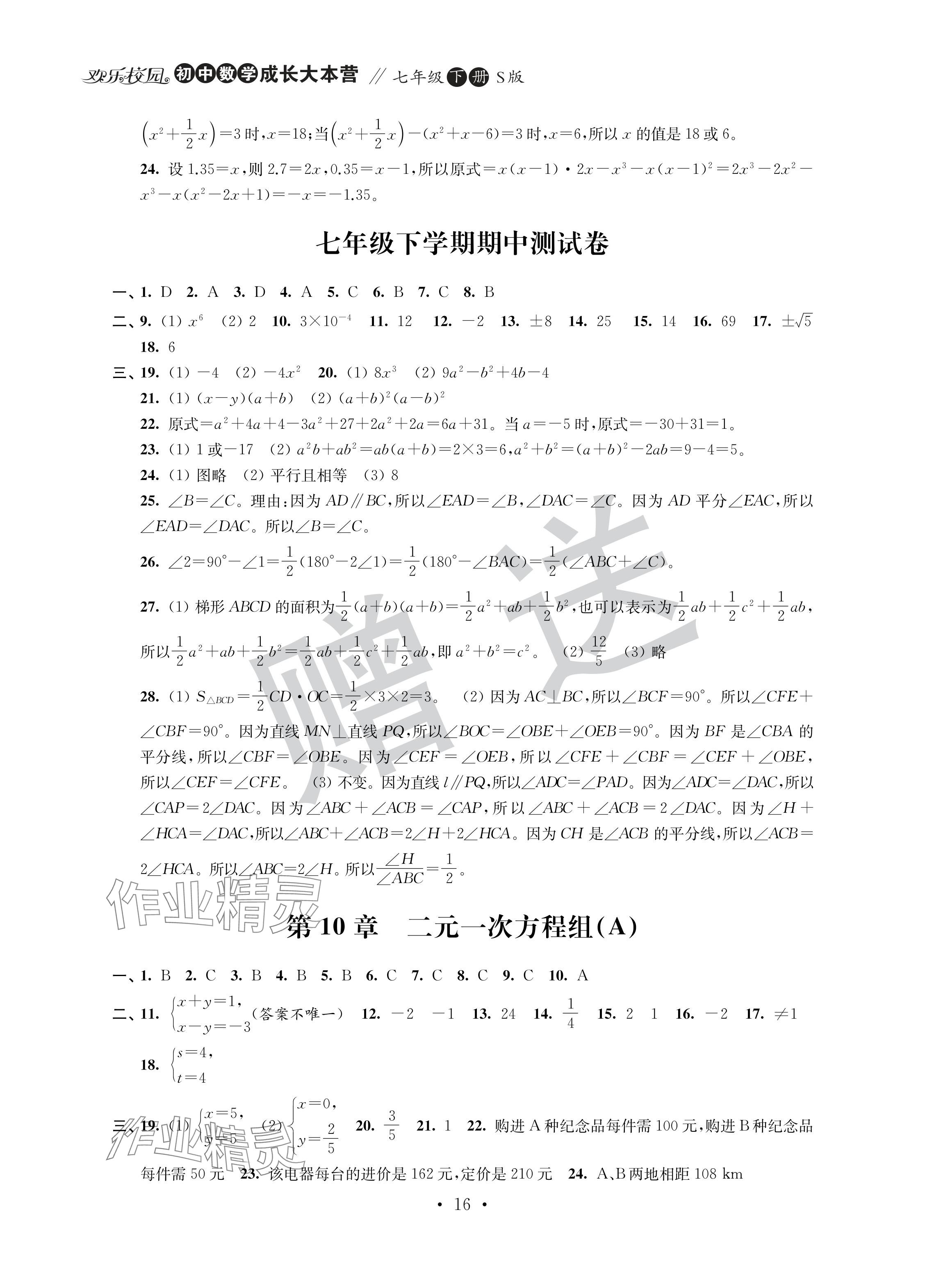 注:目前有些书本章节名称可能整理的还不是很完善,但都是按照顺序排列的,请同学们按照顺序仔细查找。练习册 2024年欢乐校园智慧金典成长大本营七年级数学下册苏科版 答案主要是用来给同学们做完题方便对答案用的,请勿直接抄袭。