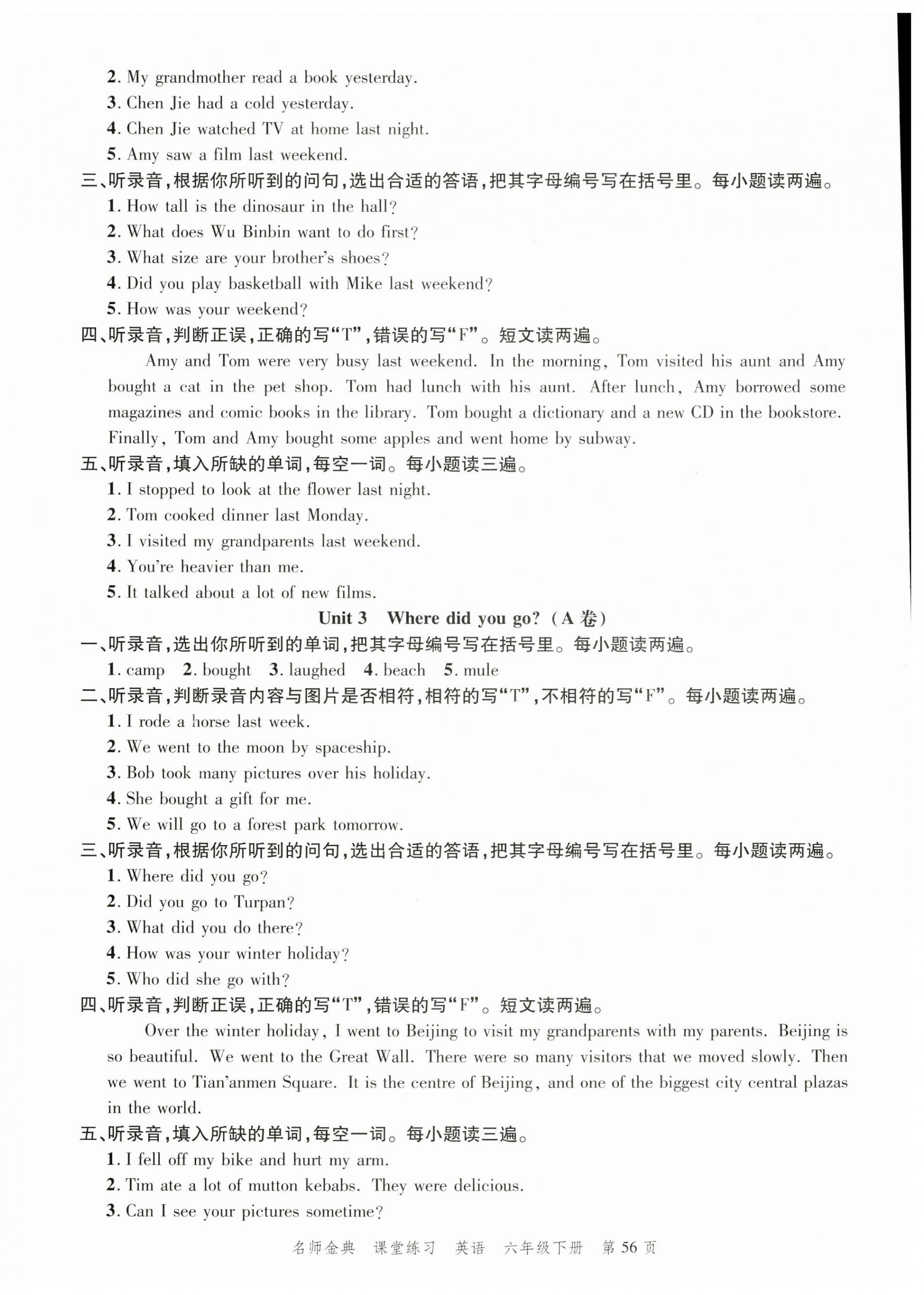 注:目前有些书本章节名称可能整理的还不是很完善,但都是按照顺序排列的,请同学们按照顺序仔细查找。练习册 2024年南粤学典名师金典测试卷六年级英语下册人教版 答案主要是用来给同学们做完题方便对答案用的,请勿直接抄袭。