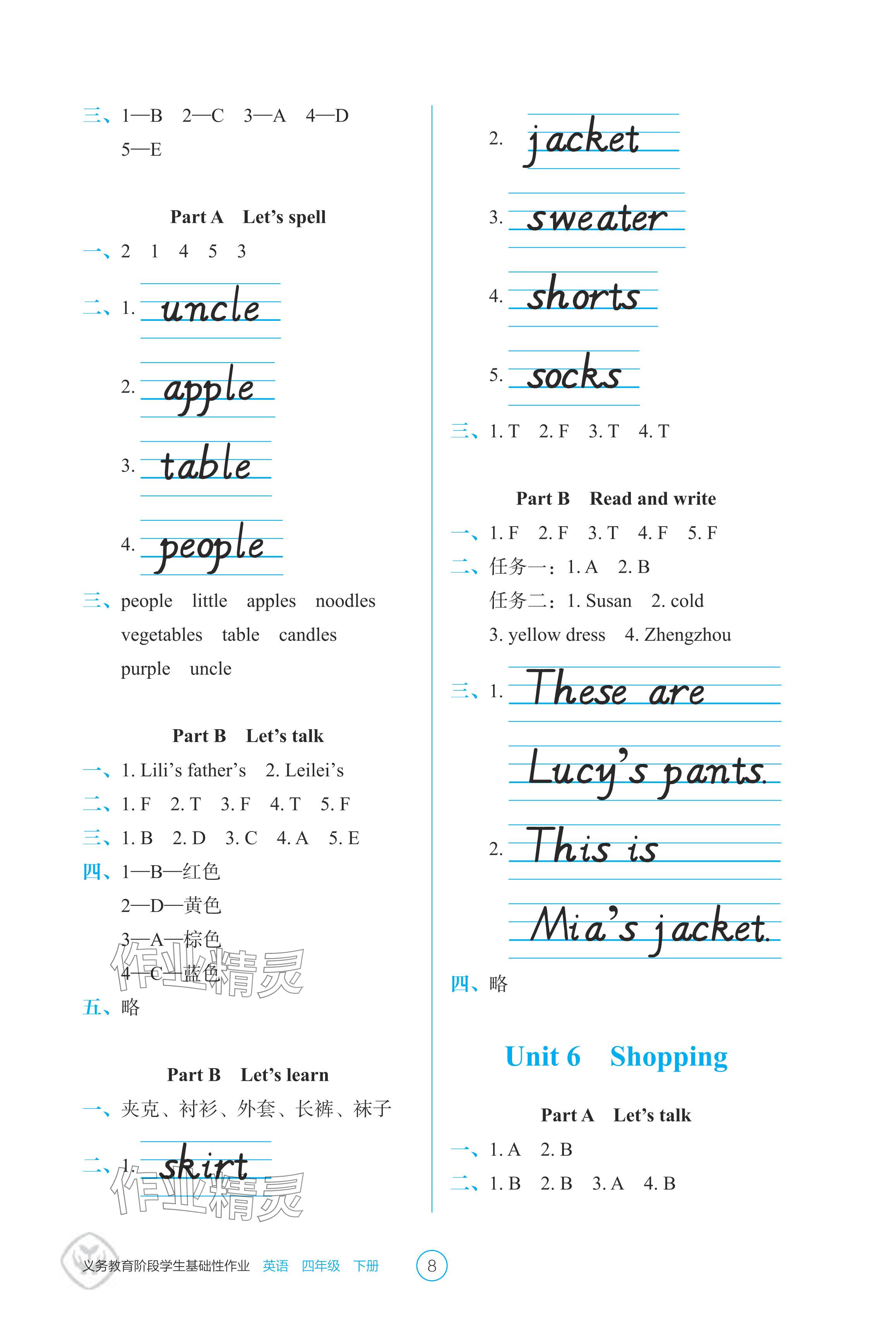 注:目前有些书本章节名称可能整理的还不是很完善,但都是按照顺序排列的,请同学们按照顺序仔细查找。练习册 2024年学生基础性作业四年级英语下册人教版 答案主要是用来给同学们做完题方便对答案用的,请勿直接抄袭。