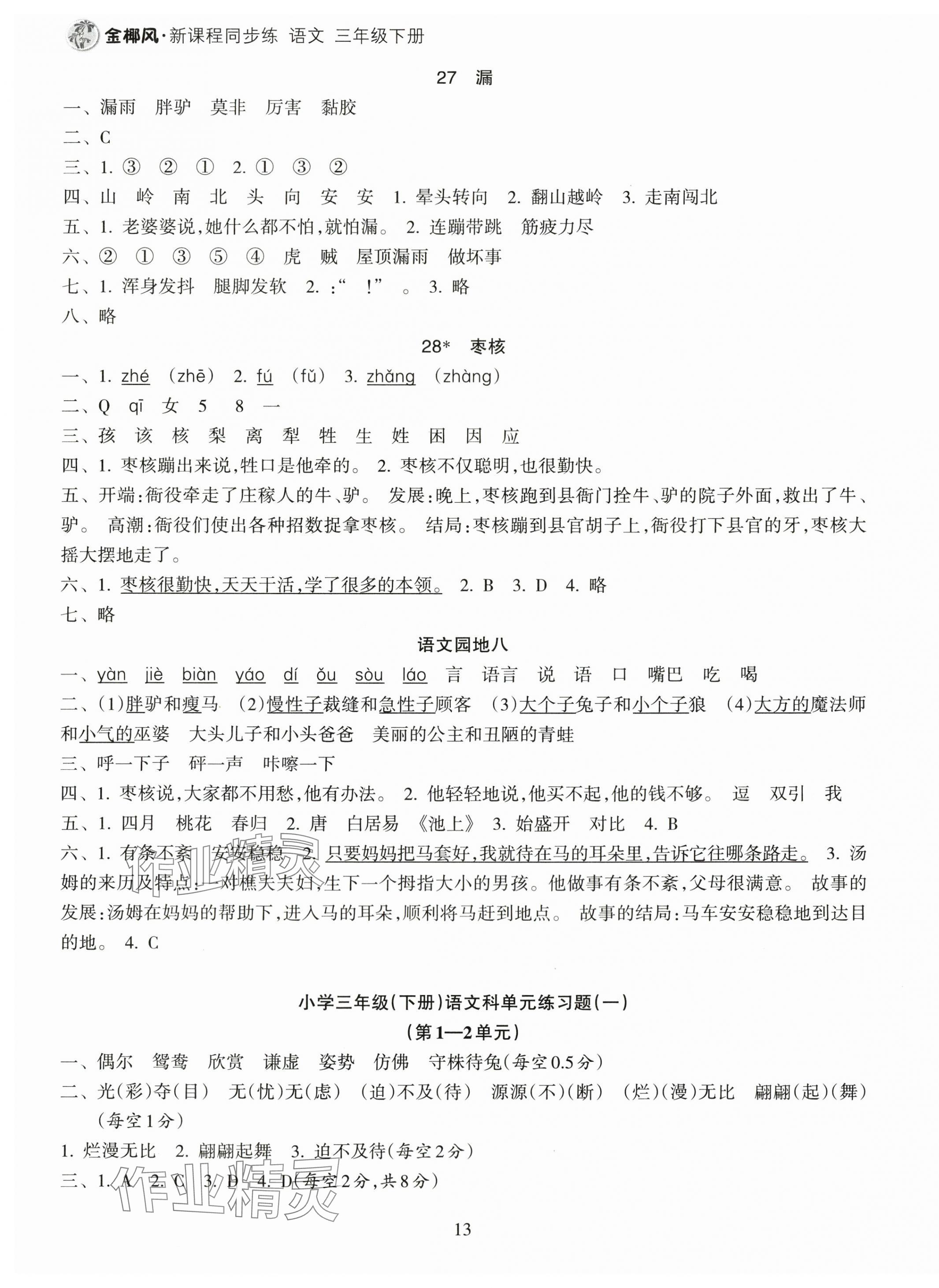 注:目前有些书本章节名称可能整理的还不是很完善,但都是按照顺序排列的,请同学们按照顺序仔细查找。练习册 2024年金椰风新课程同步练三年级语文下册人教版 答案主要是用来给同学们做完题方便对答案用的,请勿直接抄袭。