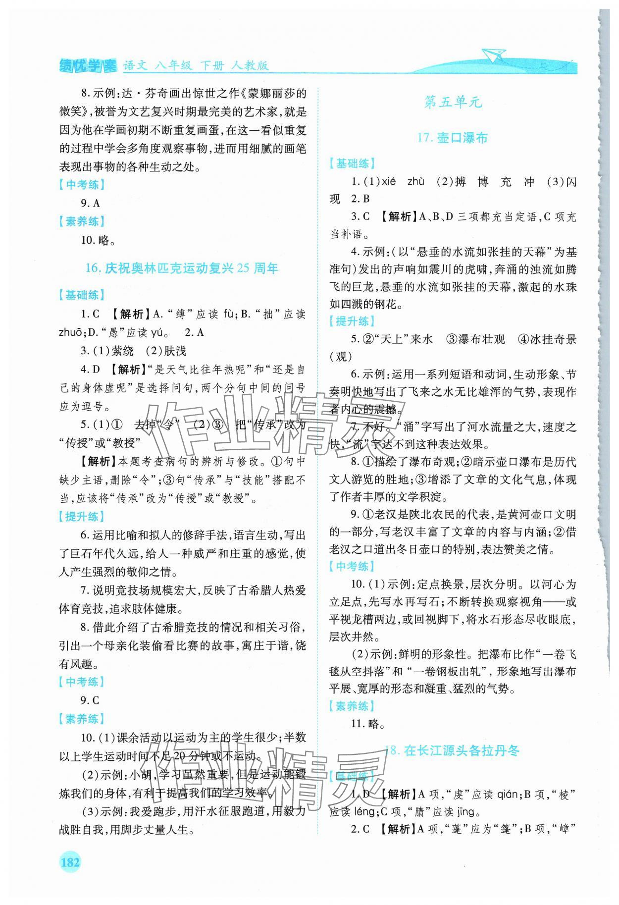注:目前有些书本章节名称可能整理的还不是很完善,但都是按照顺序排列的,请同学们按照顺序仔细查找。练习册 2024年绩优学案八年级语文下册人教版 答案主要是用来给同学们做完题方便对答案用的,请勿直接抄袭。