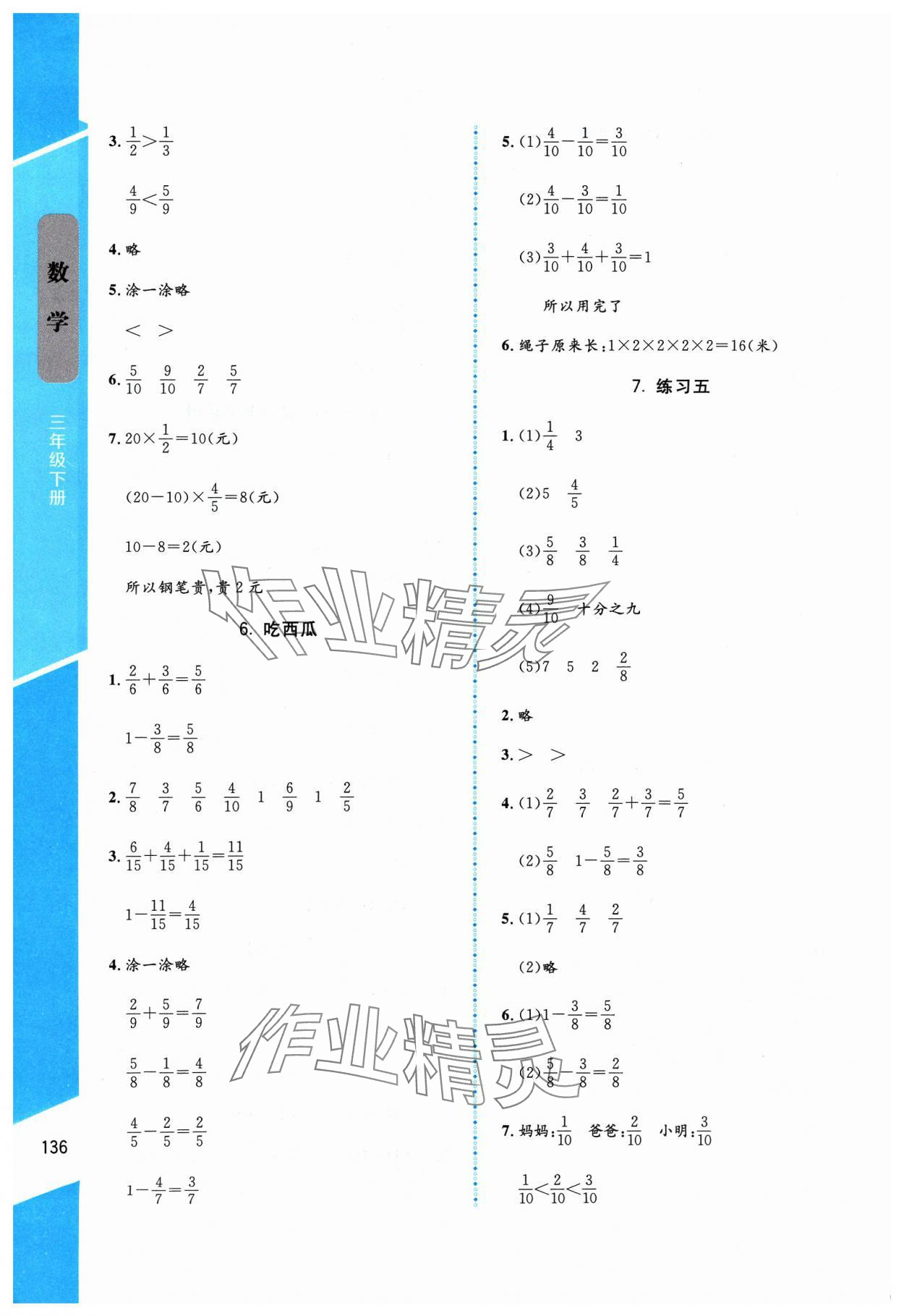 注:目前有些书本章节名称可能整理的还不是很完善,但都是按照顺序排列的,请同学们按照顺序仔细查找。练习册 2024年伴你成长北京师范大学出版社三年级数学下册北师大版山西专版 答案主要是用来给同学们做完题方便对答案用的,请勿直接抄袭。