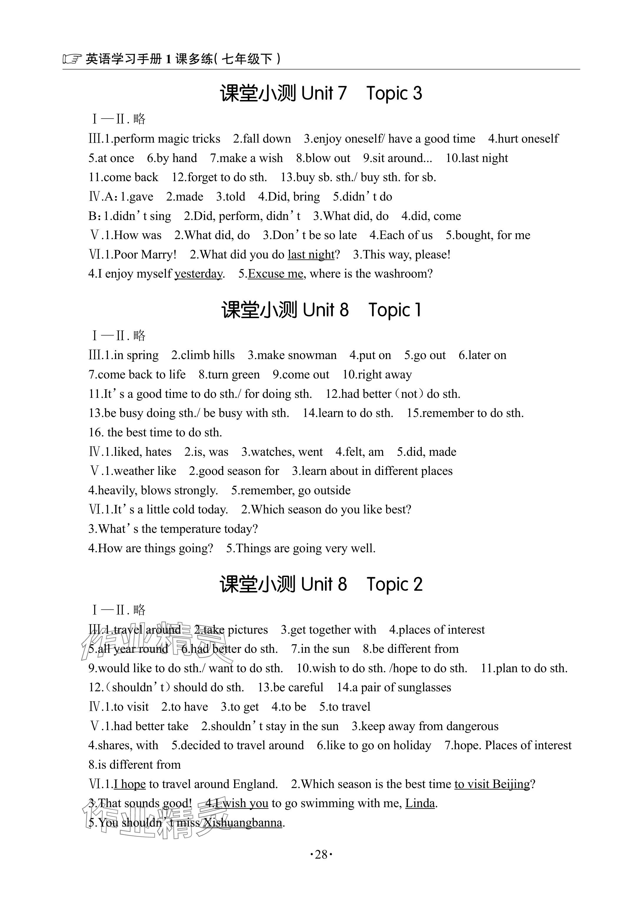 注:目前有些书本章节名称可能整理的还不是很完善,但都是按照顺序排列的,请同学们按照顺序仔细查找。练习册 2024年英语学习手册1课多练七年级下册仁爱版福建专版 答案主要是用来给同学们做完题方便对答案用的,请勿直接抄袭。