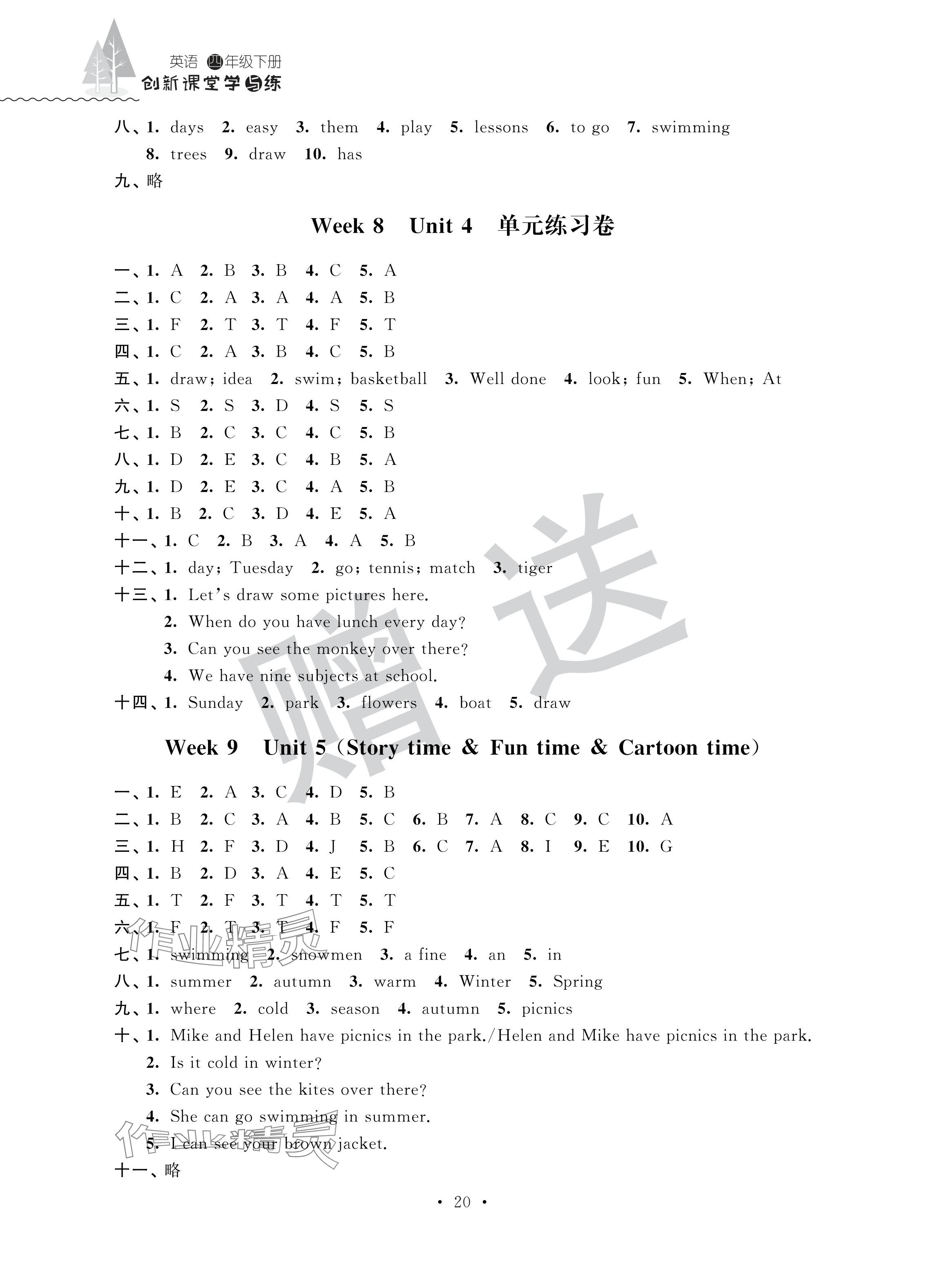 注:目前有些书本章节名称可能整理的还不是很完善,但都是按照顺序排列的,请同学们按照顺序仔细查找。练习册 2024年创新课堂学与练四年级英语下册译林版 答案主要是用来给同学们做完题方便对答案用的,请勿直接抄袭。