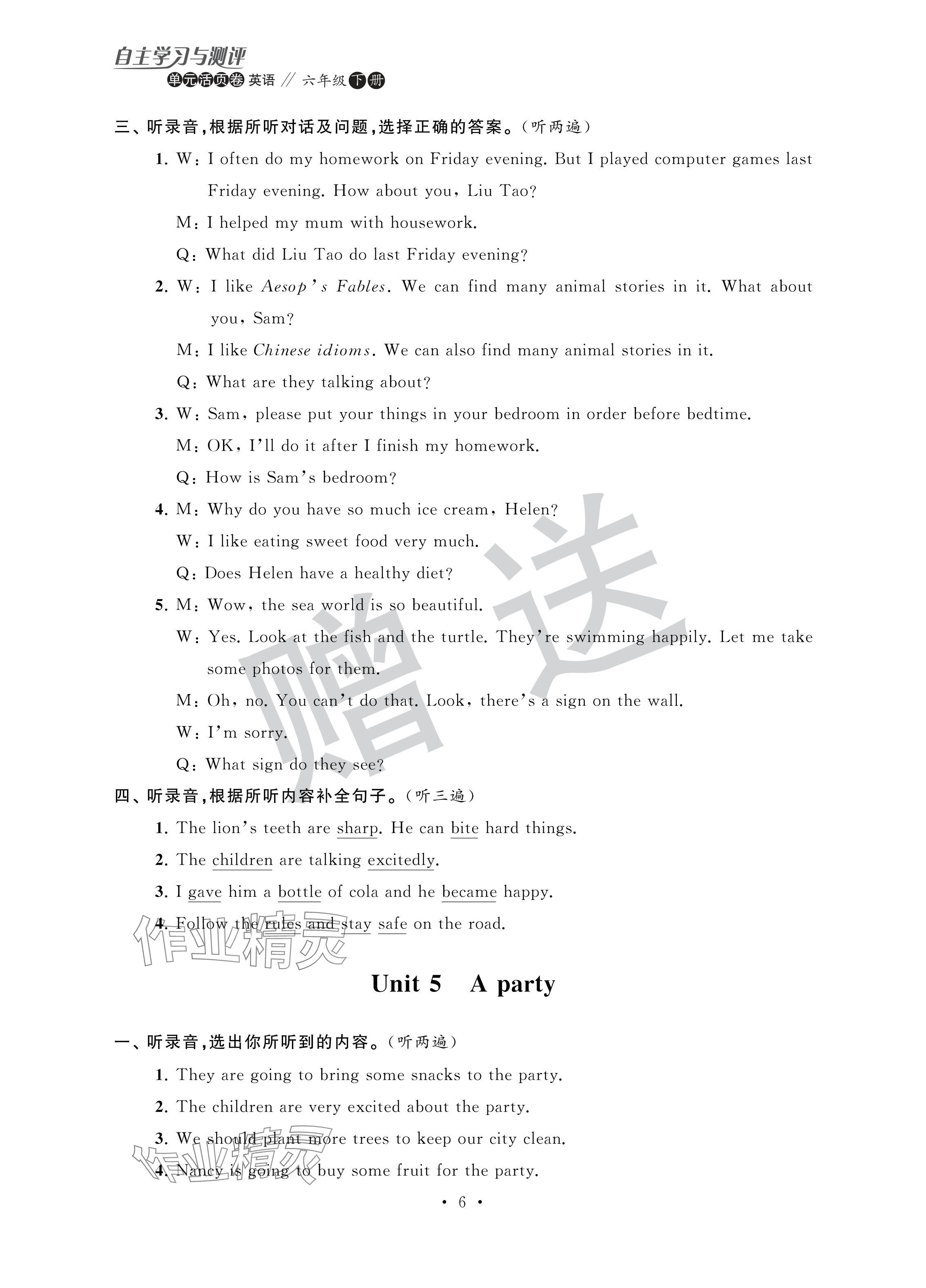 注:目前有些书本章节名称可能整理的还不是很完善,但都是按照顺序排列的,请同学们按照顺序仔细查找。练习册 2024年自主学习与测评单元活页卷六年级英语下册译林版 答案主要是用来给同学们做完题方便对答案用的,请勿直接抄袭。