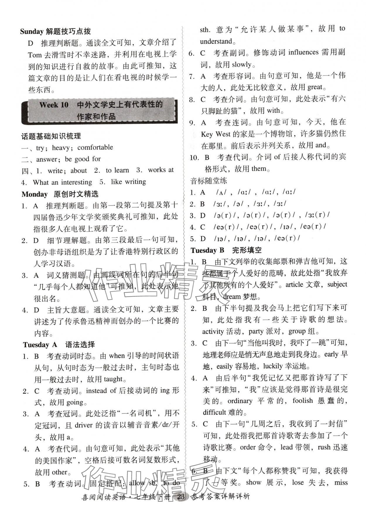 注:目前有些书本章节名称可能整理的还不是很完善,但都是按照顺序排列的,请同学们按照顺序仔细查找。练习册 2024年喜阅阅读英语周周练七年级B版 答案主要是用来给同学们做完题方便对答案用的,请勿直接抄袭。