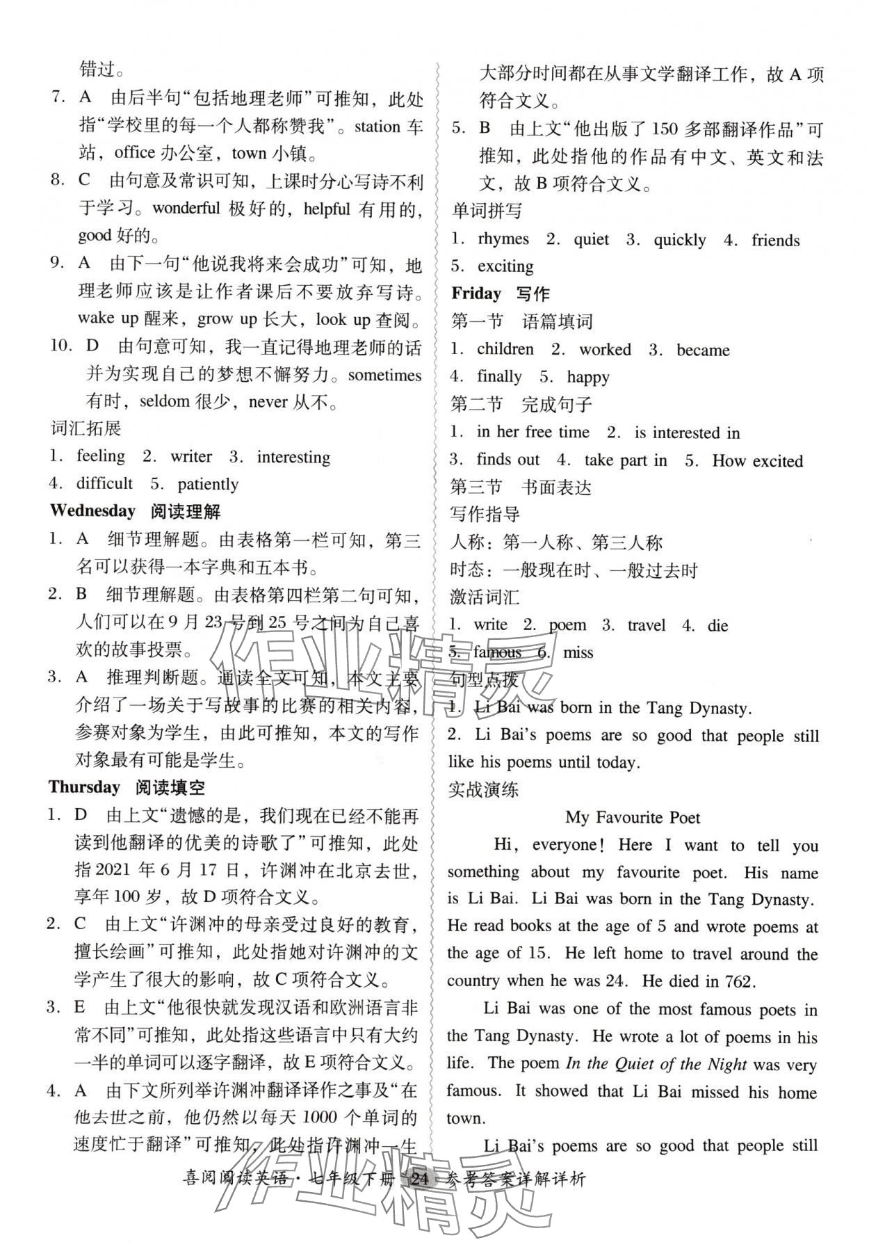 注:目前有些书本章节名称可能整理的还不是很完善,但都是按照顺序排列的,请同学们按照顺序仔细查找。练习册 2024年喜阅阅读英语周周练七年级B版 答案主要是用来给同学们做完题方便对答案用的,请勿直接抄袭。