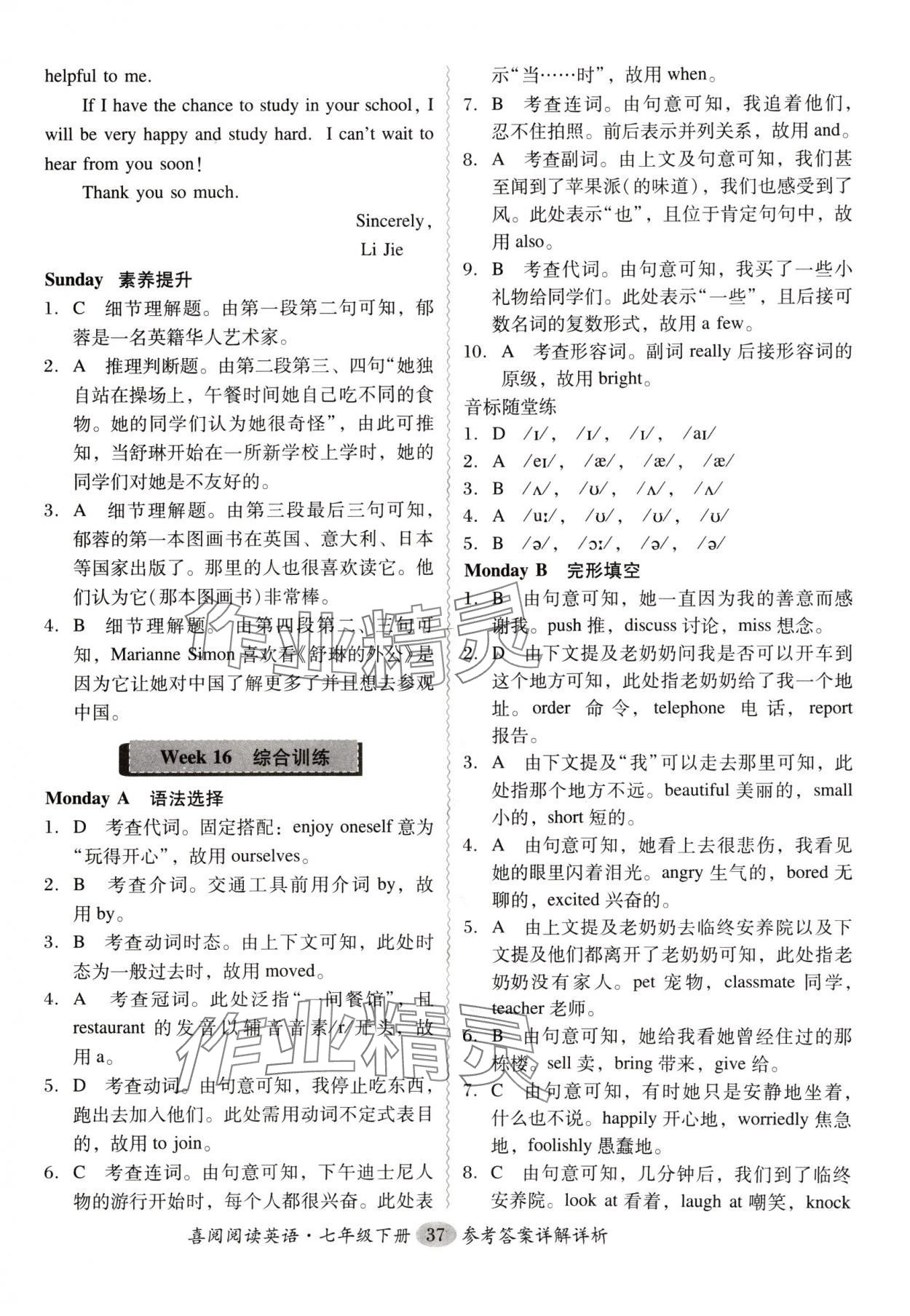 注:目前有些书本章节名称可能整理的还不是很完善,但都是按照顺序排列的,请同学们按照顺序仔细查找。练习册 2024年喜阅阅读英语周周练七年级B版 答案主要是用来给同学们做完题方便对答案用的,请勿直接抄袭。
