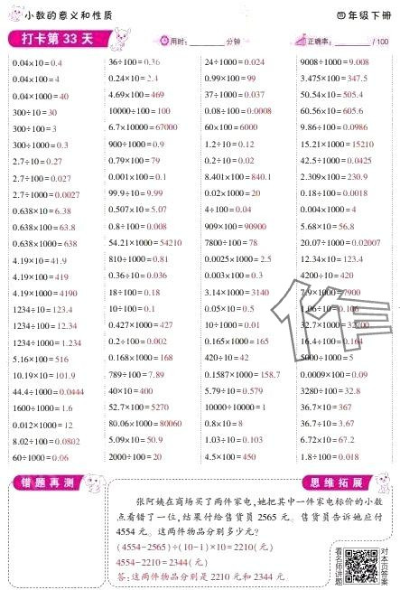 2024年口算题10000道四年级数学下册人教版