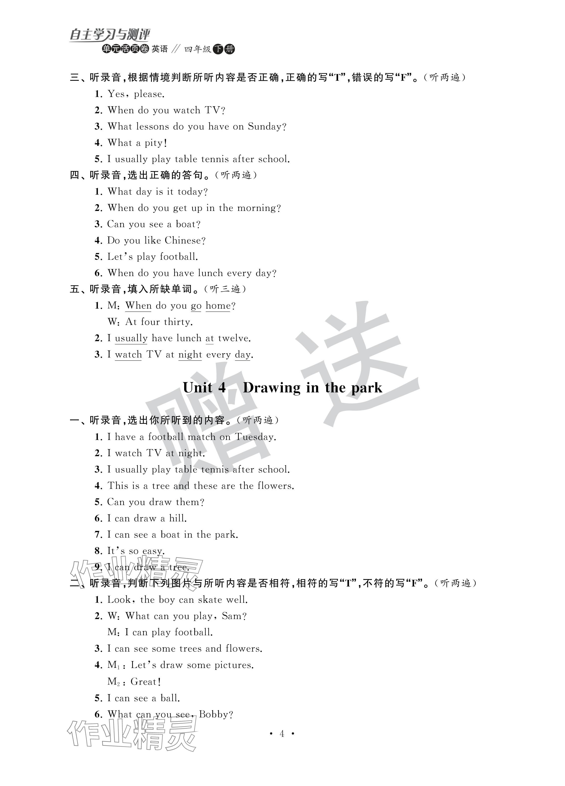 注:目前有些书本章节名称可能整理的还不是很完善,但都是按照顺序排列的,请同学们按照顺序仔细查找。练习册 2024年自主学习与测评单元活页卷四年级英语下册译林版 答案主要是用来给同学们做完题方便对答案用的,请勿直接抄袭。