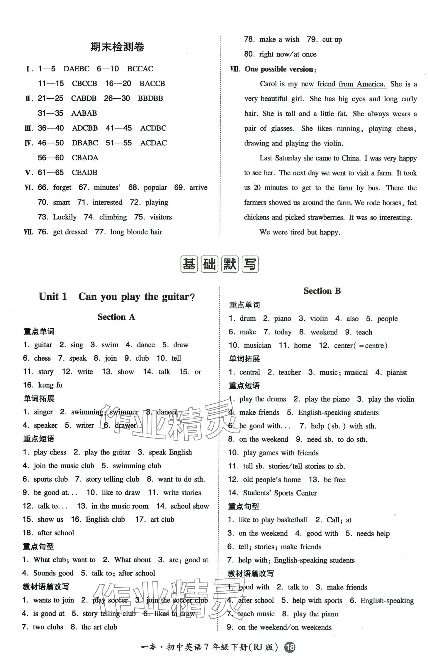 注:目前有些书本章节名称可能整理的还不是很完善,但都是按照顺序排列的,请同学们按照顺序仔细查找。练习册 2024年一本七年级英语下册人教版 答案主要是用来给同学们做完题方便对答案用的,请勿直接抄袭。