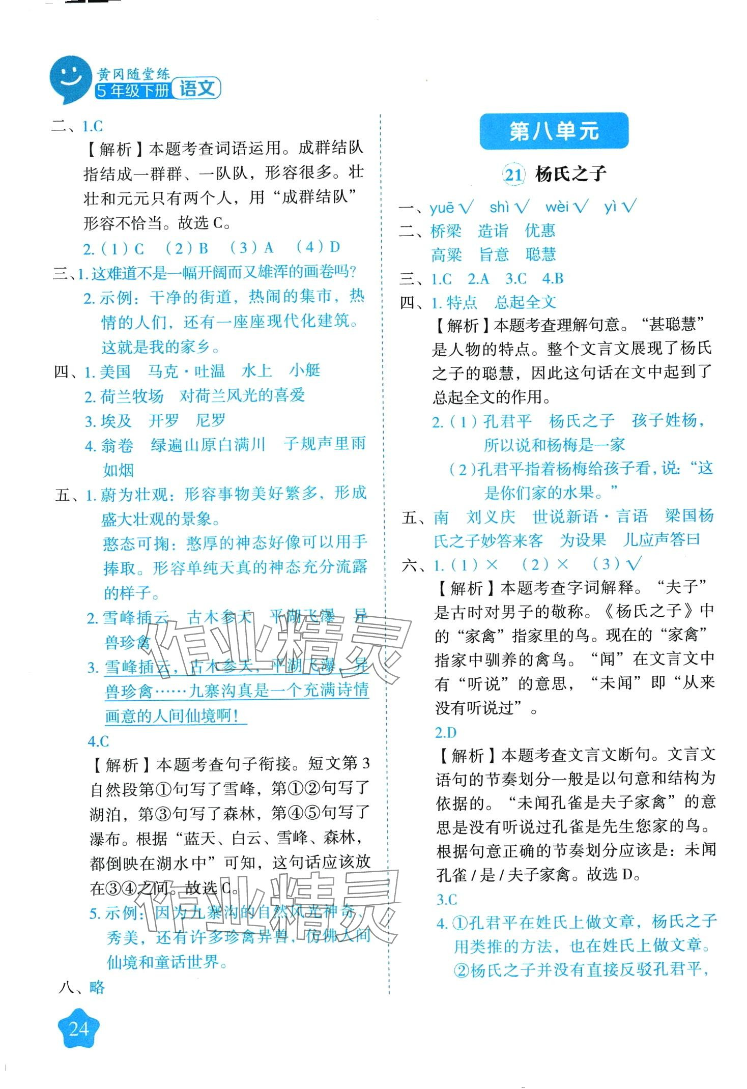 注:目前有些书本章节名称可能整理的还不是很完善,但都是按照顺序排列的,请同学们按照顺序仔细查找。练习册 2024年黄冈随堂练五年级语文下册人教版 答案主要是用来给同学们做完题方便对答案用的,请勿直接抄袭。