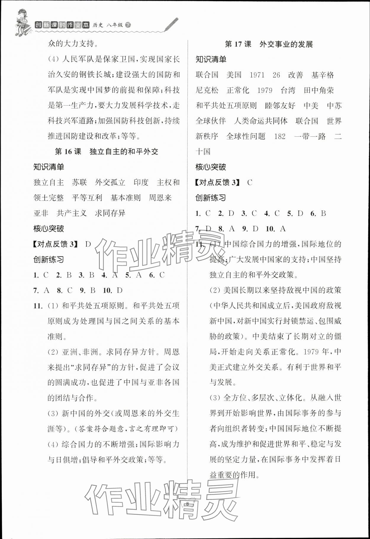 注:目前有些书本章节名称可能整理的还不是很完善,但都是按照顺序排列的,请同学们按照顺序仔细查找。练习册 2024年创新课时作业本江苏凤凰少年儿童出版社八年级历史下册人教版 答案主要是用来给同学们做完题方便对答案用的,请勿直接抄袭。