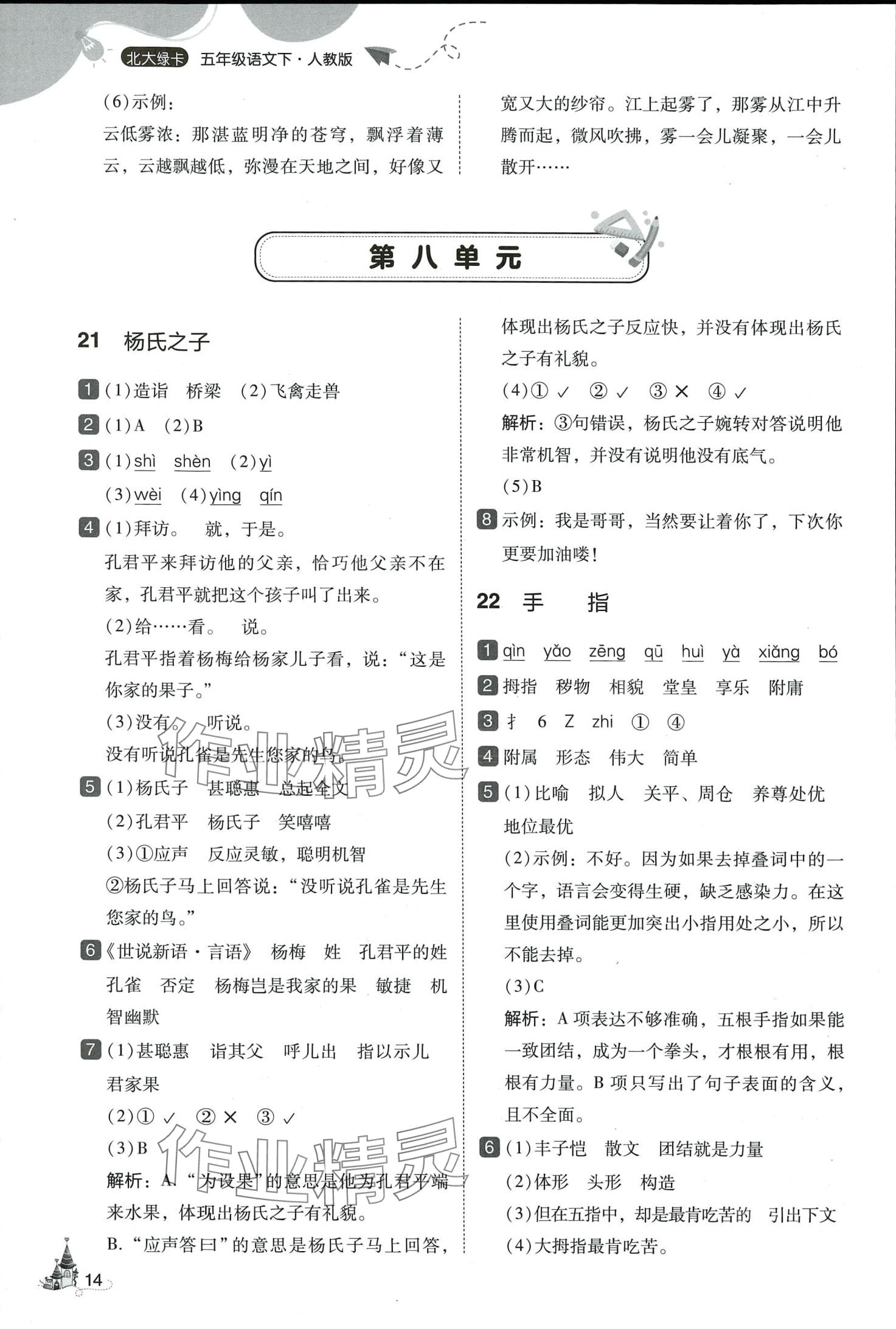 注:目前有些书本章节名称可能整理的还不是很完善,但都是按照顺序排列的,请同学们按照顺序仔细查找。练习册 2024年北大绿卡五年级语文下册人教版深圳专版 答案主要是用来给同学们做完题方便对答案用的,请勿直接抄袭。