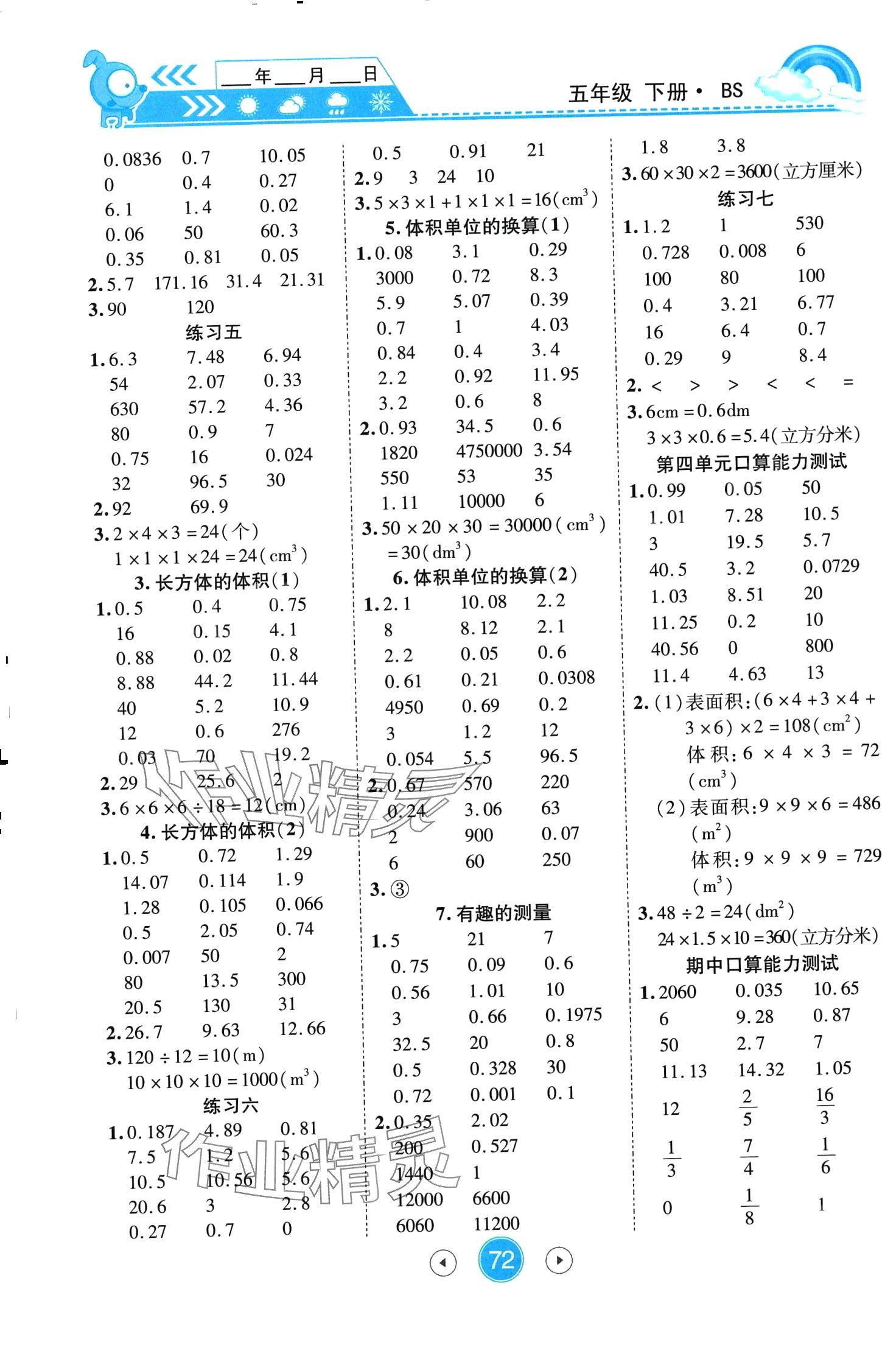 注:目前有些书本章节名称可能整理的还不是很完善,但都是按照顺序排列的,请同学们按照顺序仔细查找。练习册 2024年小状元数学天天练口算题卡大通关五年级下册北师大版 答案主要是用来给同学们做完题方便对答案用的,请勿直接抄袭。
