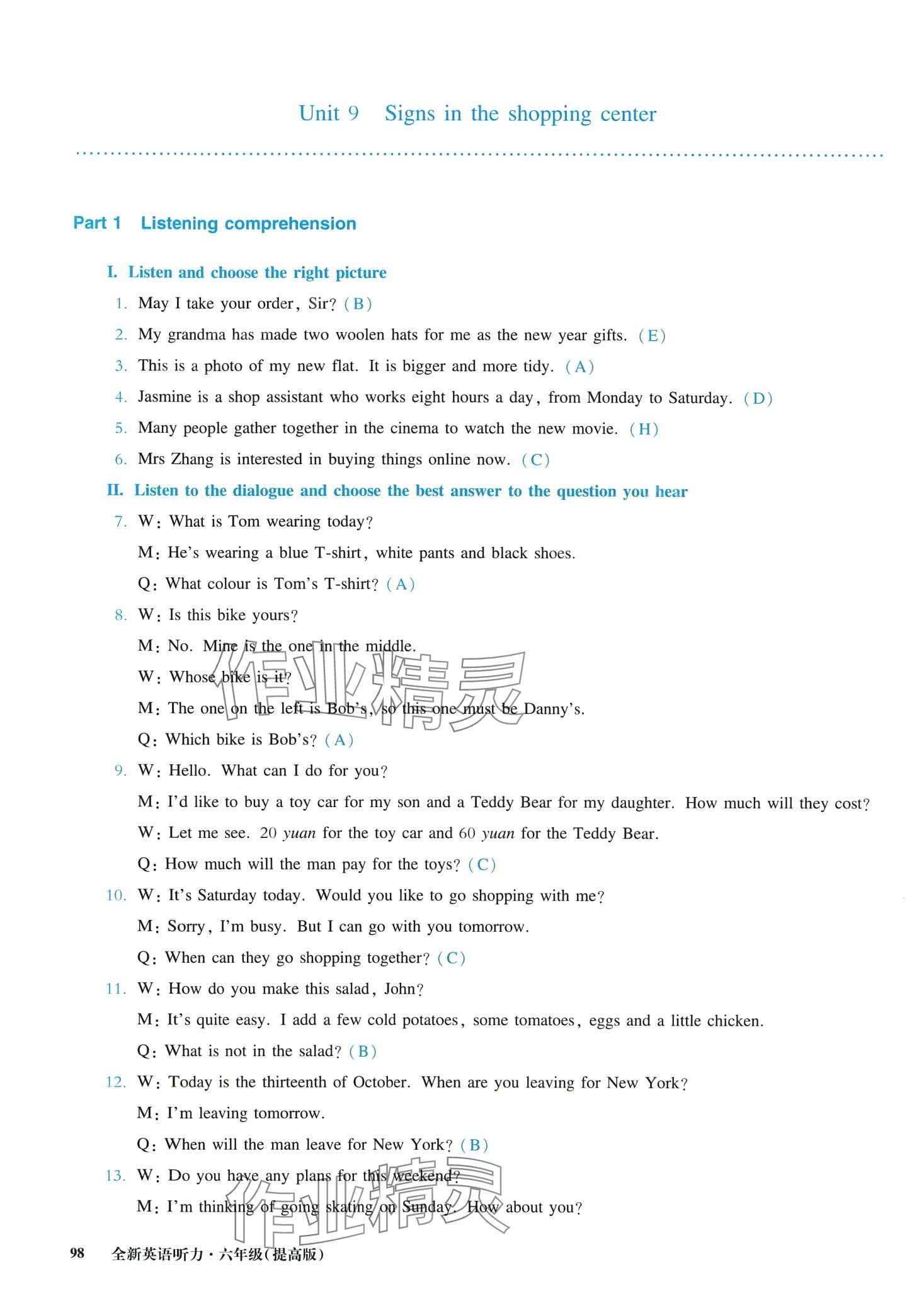 注:目前有些书本章节名称可能整理的还不是很完善,但都是按照顺序排列的,请同学们按照顺序仔细查找。练习册 2024年全新英语听力六年级提高版 答案主要是用来给同学们做完题方便对答案用的,请勿直接抄袭。