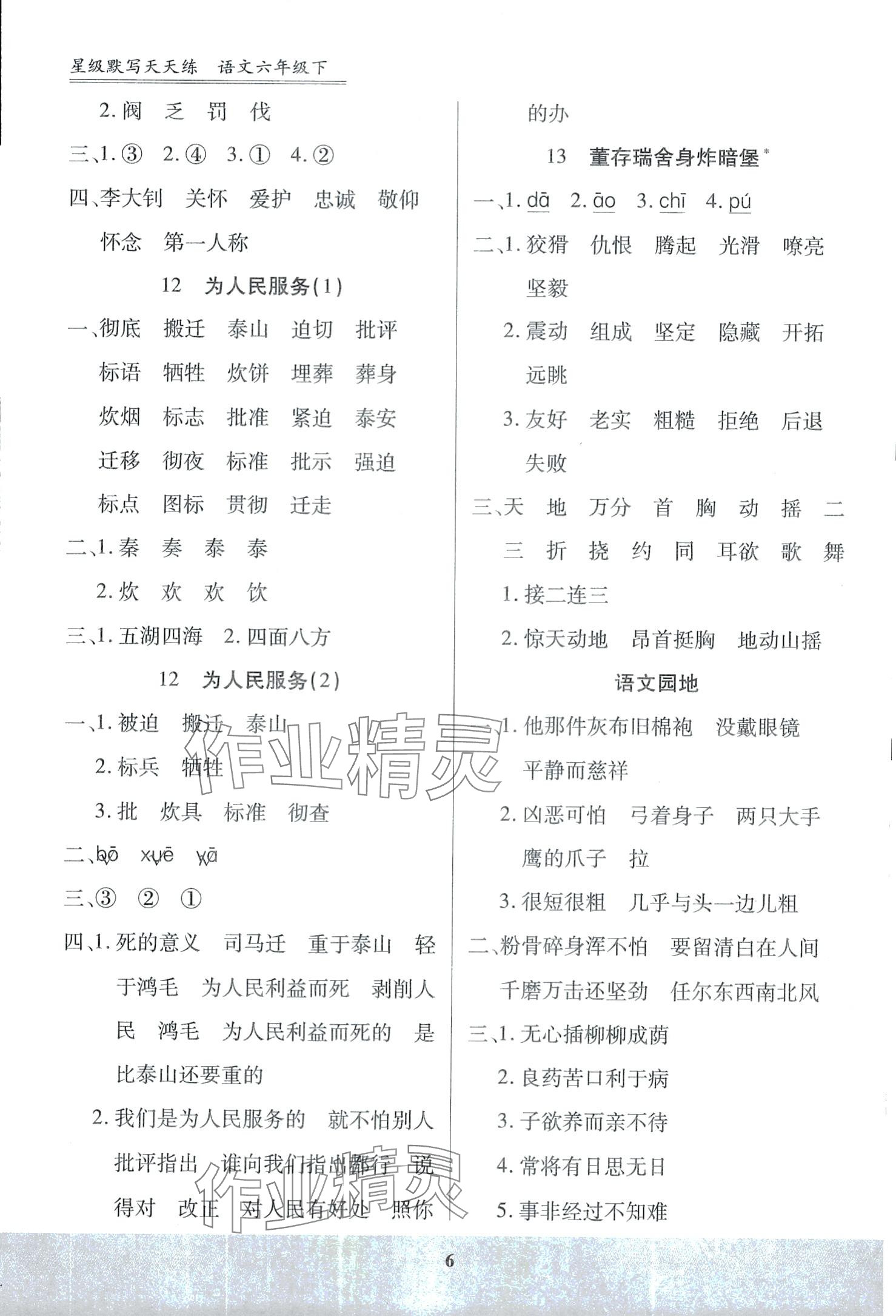 注:目前有些书本章节名称可能整理的还不是很完善,但都是按照顺序排列的,请同学们按照顺序仔细查找。练习册 2024年星级默写天天练六年级语文下册人教版 答案主要是用来给同学们做完题方便对答案用的,请勿直接抄袭。