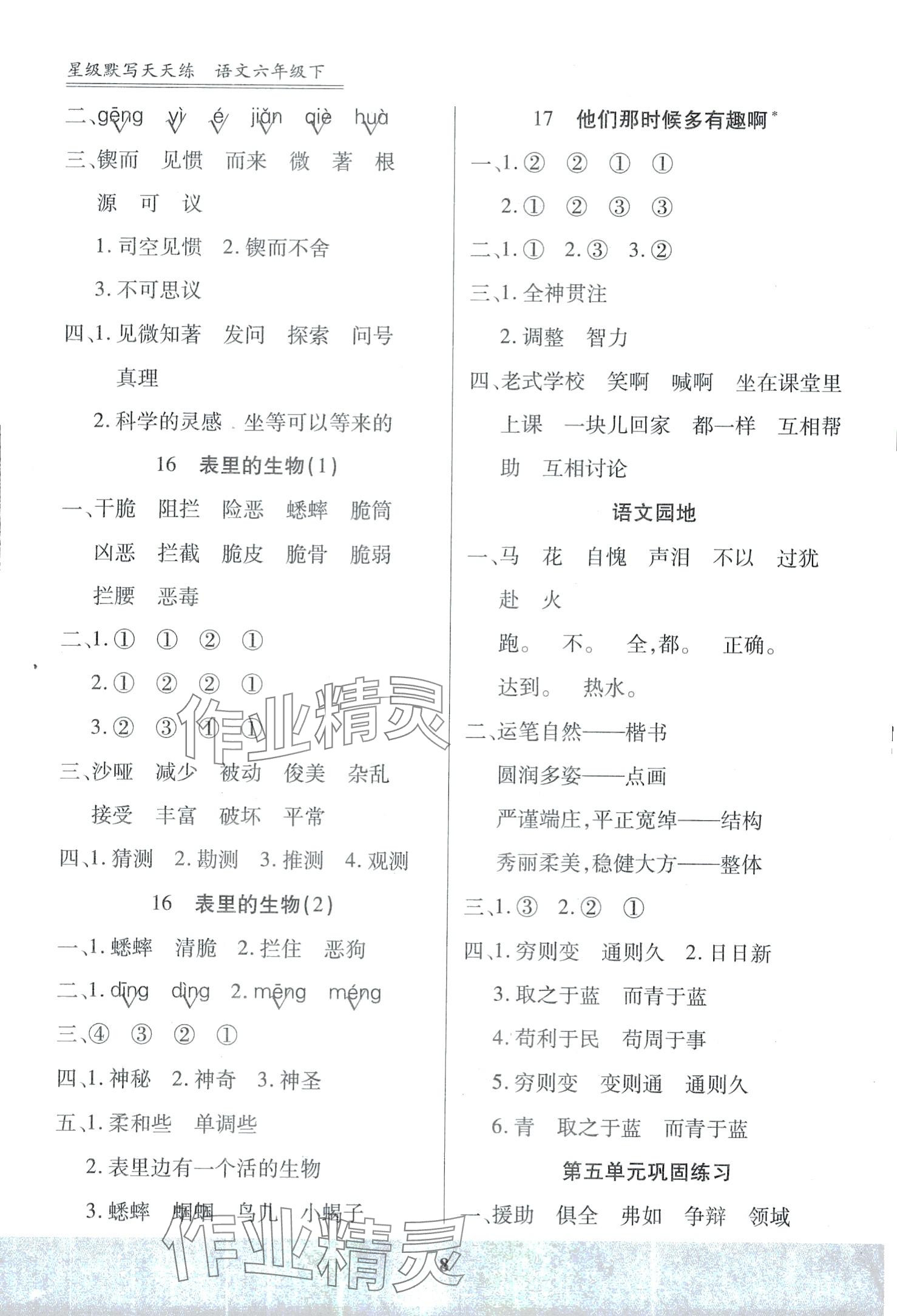 注:目前有些书本章节名称可能整理的还不是很完善,但都是按照顺序排列的,请同学们按照顺序仔细查找。练习册 2024年星级默写天天练六年级语文下册人教版 答案主要是用来给同学们做完题方便对答案用的,请勿直接抄袭。