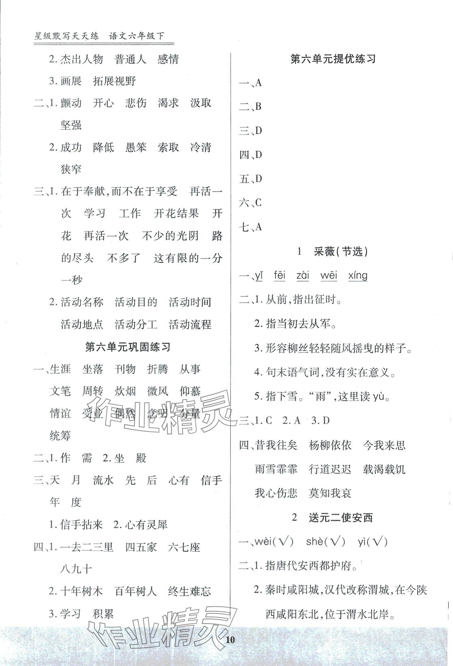 注:目前有些书本章节名称可能整理的还不是很完善,但都是按照顺序排列的,请同学们按照顺序仔细查找。练习册 2024年星级默写天天练六年级语文下册人教版 答案主要是用来给同学们做完题方便对答案用的,请勿直接抄袭。