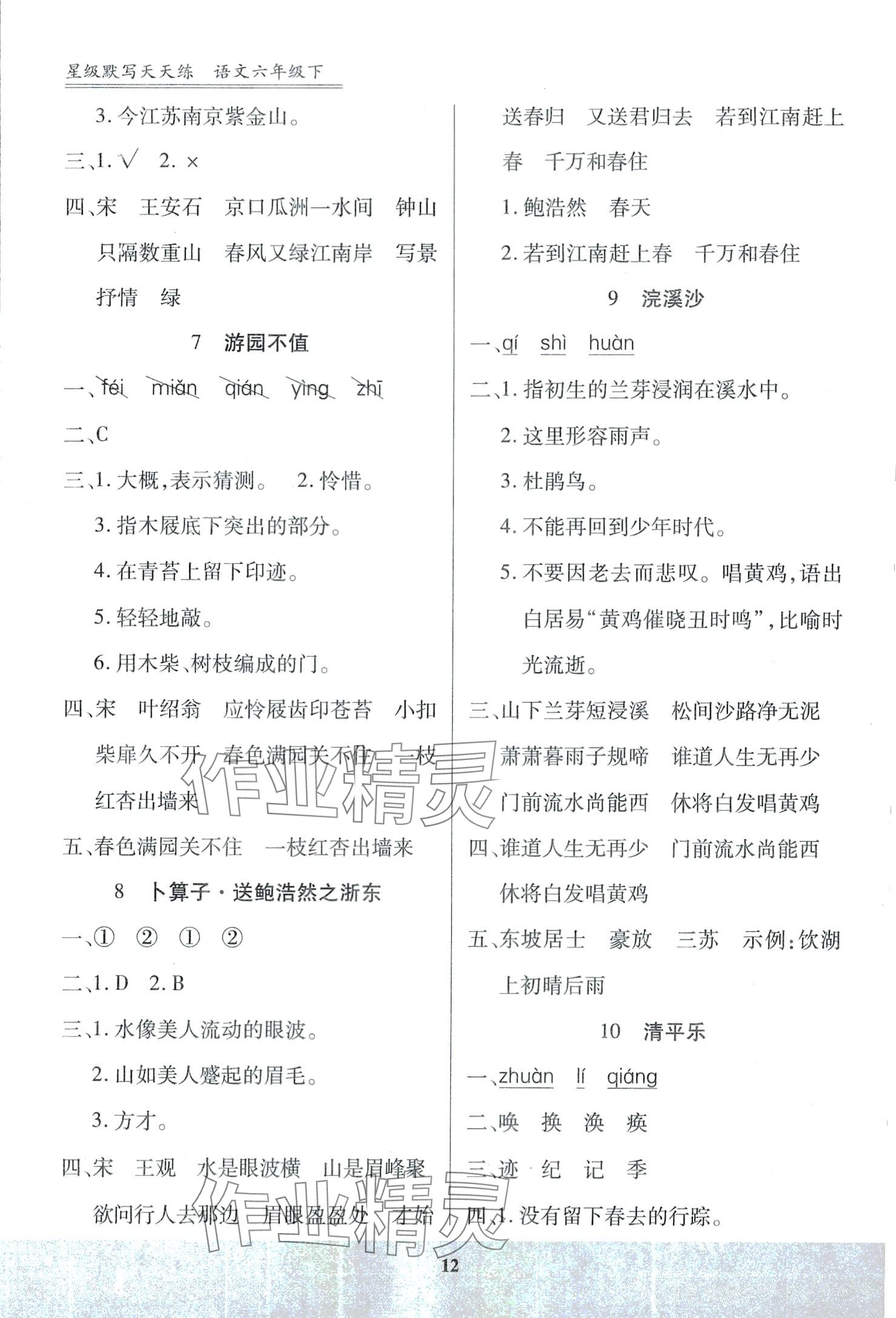 注:目前有些书本章节名称可能整理的还不是很完善,但都是按照顺序排列的,请同学们按照顺序仔细查找。练习册 2024年星级默写天天练六年级语文下册人教版 答案主要是用来给同学们做完题方便对答案用的,请勿直接抄袭。