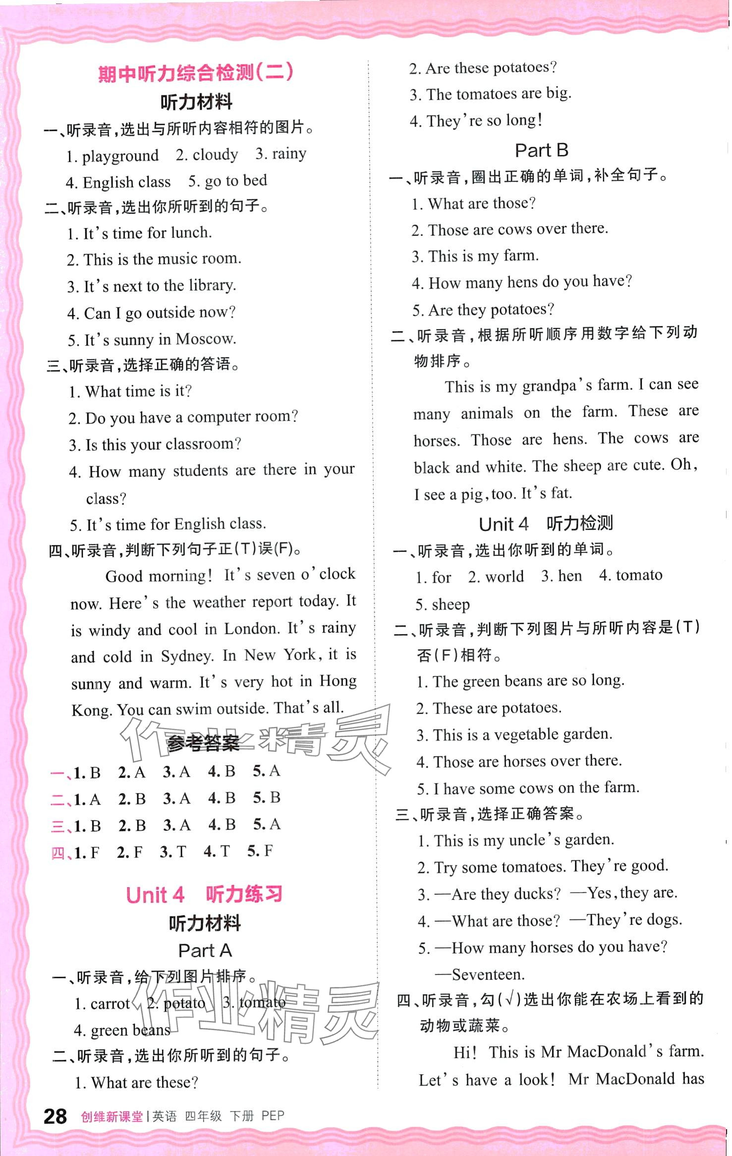 注:目前有些书本章节名称可能整理的还不是很完善,但都是按照顺序排列的,请同学们按照顺序仔细查找。练习册 2024年创维新课堂四年级英语下册人教版 答案主要是用来给同学们做完题方便对答案用的,请勿直接抄袭。