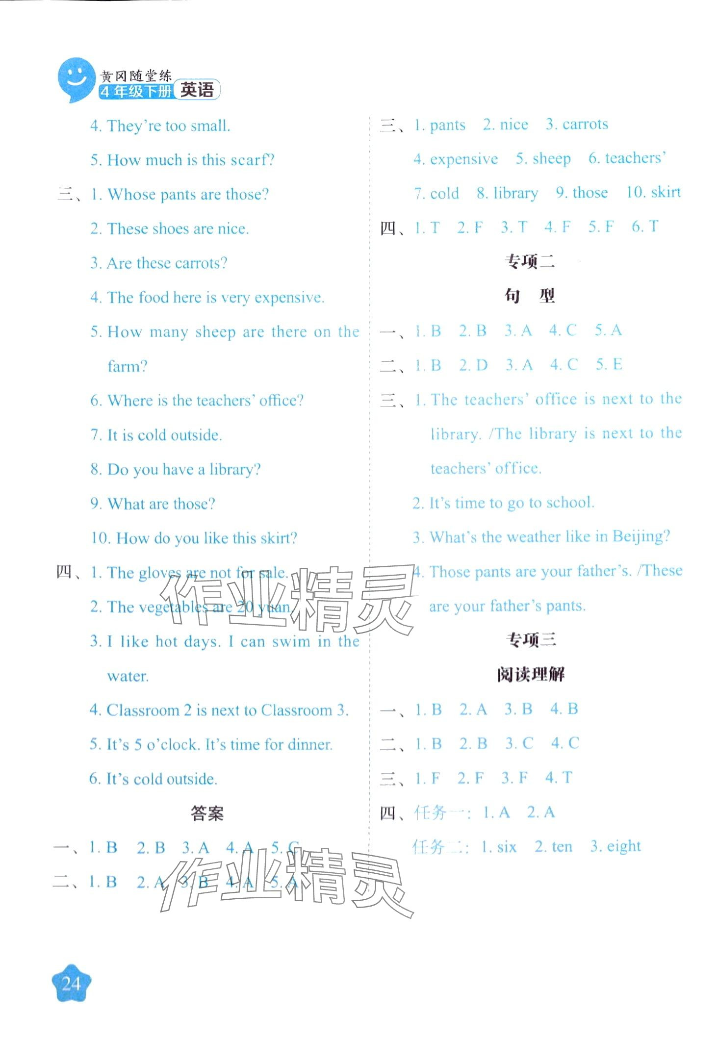 注:目前有些书本章节名称可能整理的还不是很完善,但都是按照顺序排列的,请同学们按照顺序仔细查找。练习册 2024年黄冈随堂练四年级英语下册人教版 答案主要是用来给同学们做完题方便对答案用的,请勿直接抄袭。