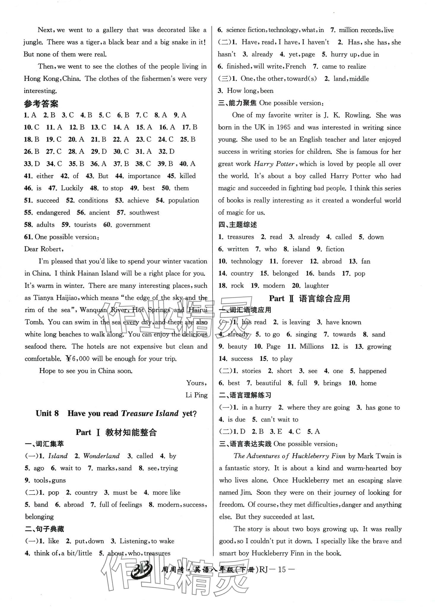 注:目前有些书本章节名称可能整理的还不是很完善,但都是按照顺序排列的,请同学们按照顺序仔细查找。练习册 2024年周周清检测八年级英语下册人教版 答案主要是用来给同学们做完题方便对答案用的,请勿直接抄袭。