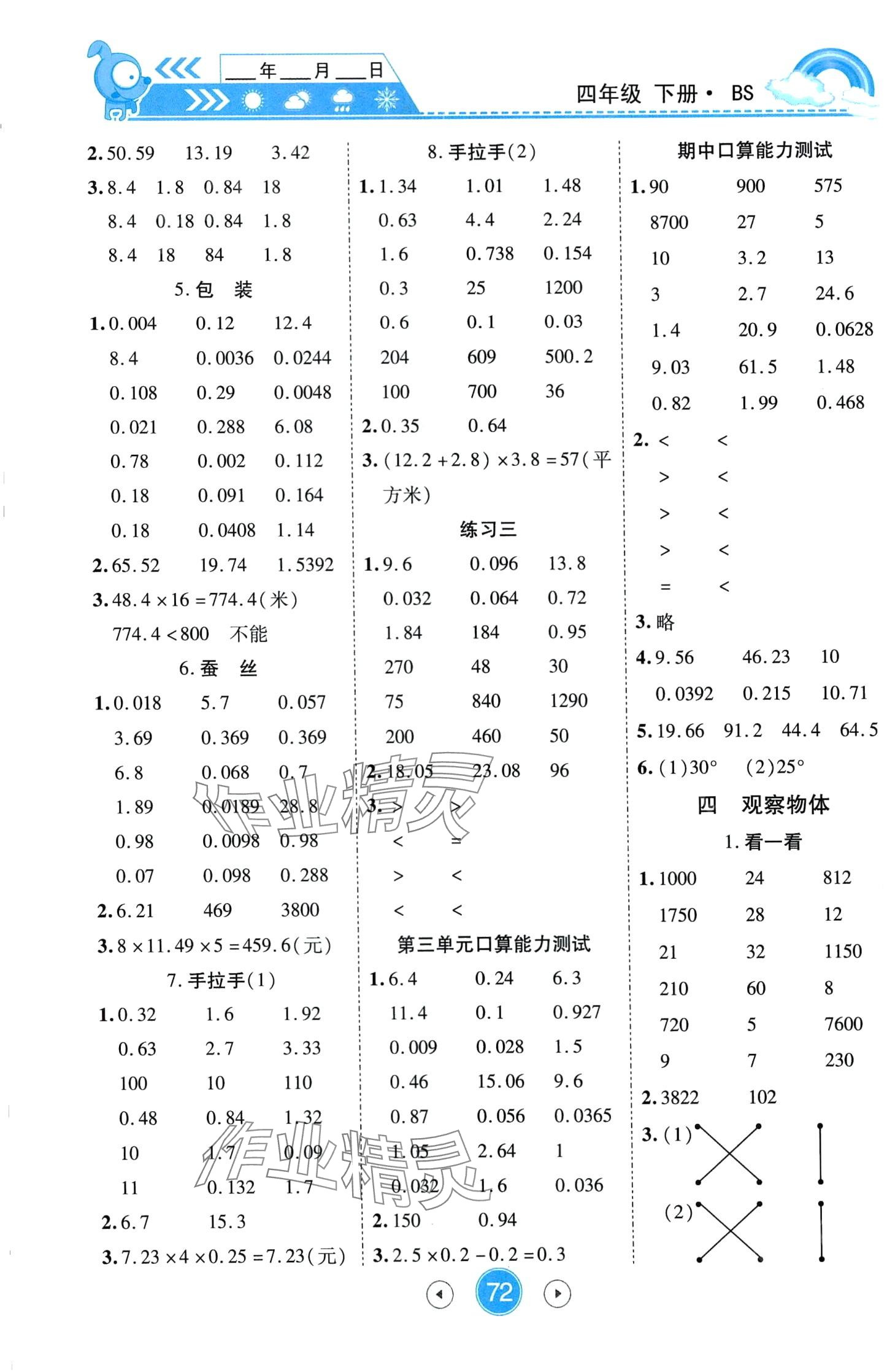 注:目前有些书本章节名称可能整理的还不是很完善,但都是按照顺序排列的,请同学们按照顺序仔细查找。练习册 2024年小状元数学天天练口算题卡加应用题四年级下册北师大版 答案主要是用来给同学们做完题方便对答案用的,请勿直接抄袭。