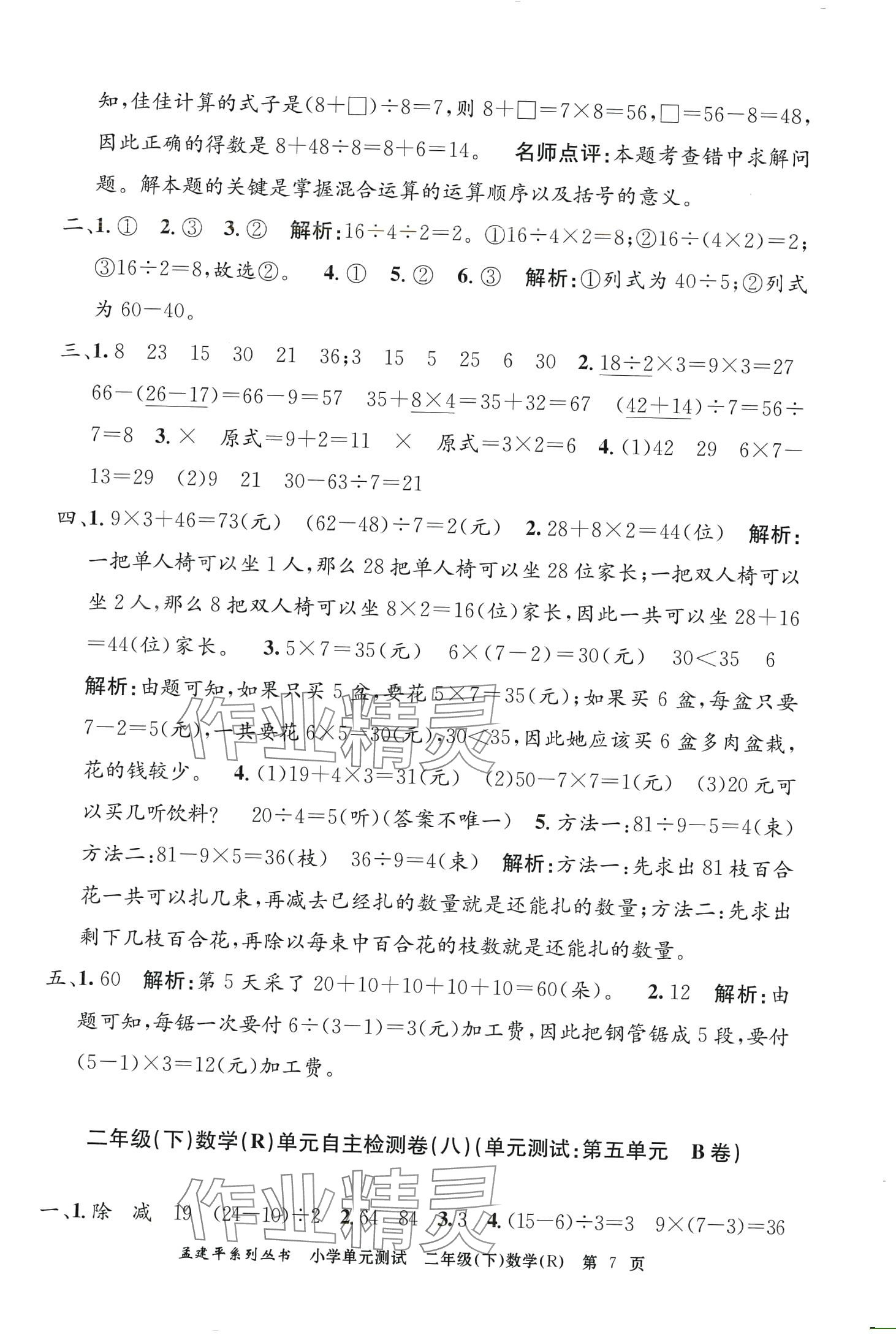 注:目前有些书本章节名称可能整理的还不是很完善,但都是按照顺序排列的,请同学们按照顺序仔细查找。练习册 2024年孟建平单元测试二年级数学下册人教版 答案主要是用来给同学们做完题方便对答案用的,请勿直接抄袭。