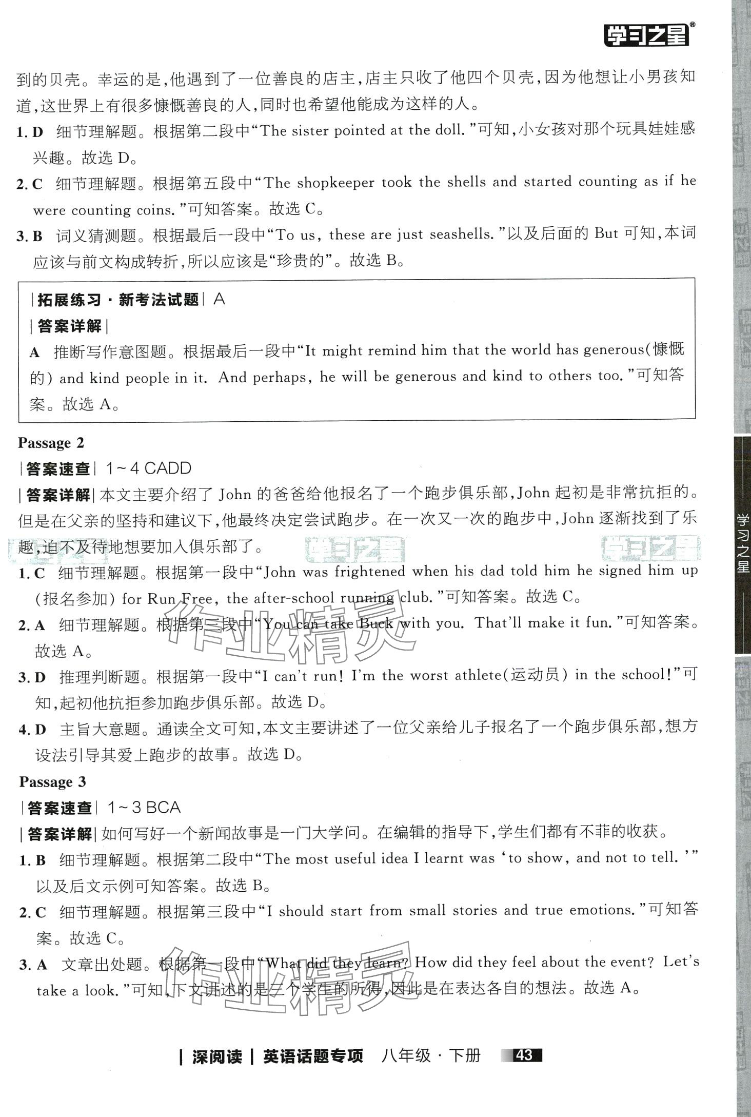 注:目前有些书本章节名称可能整理的还不是很完善,但都是按照顺序排列的,请同学们按照顺序仔细查找。练习册 2024年学习之星深阅读八年级英语下册 答案主要是用来给同学们做完题方便对答案用的,请勿直接抄袭。