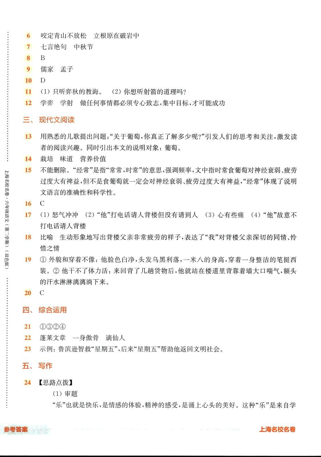注:目前有些书本章节名称可能整理的还不是很完善,但都是按照顺序排列的,请同学们按照顺序仔细查找。练习册 2024年上海名校名卷六年级语文下册人教版 答案主要是用来给同学们做完题方便对答案用的,请勿直接抄袭。
