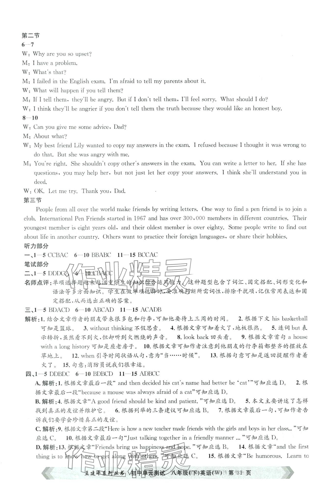注:目前有些书本章节名称可能整理的还不是很完善,但都是按照顺序排列的,请同学们按照顺序仔细查找。练习册 2024年孟建平单元测试八年级英语下册外研版 答案主要是用来给同学们做完题方便对答案用的,请勿直接抄袭。