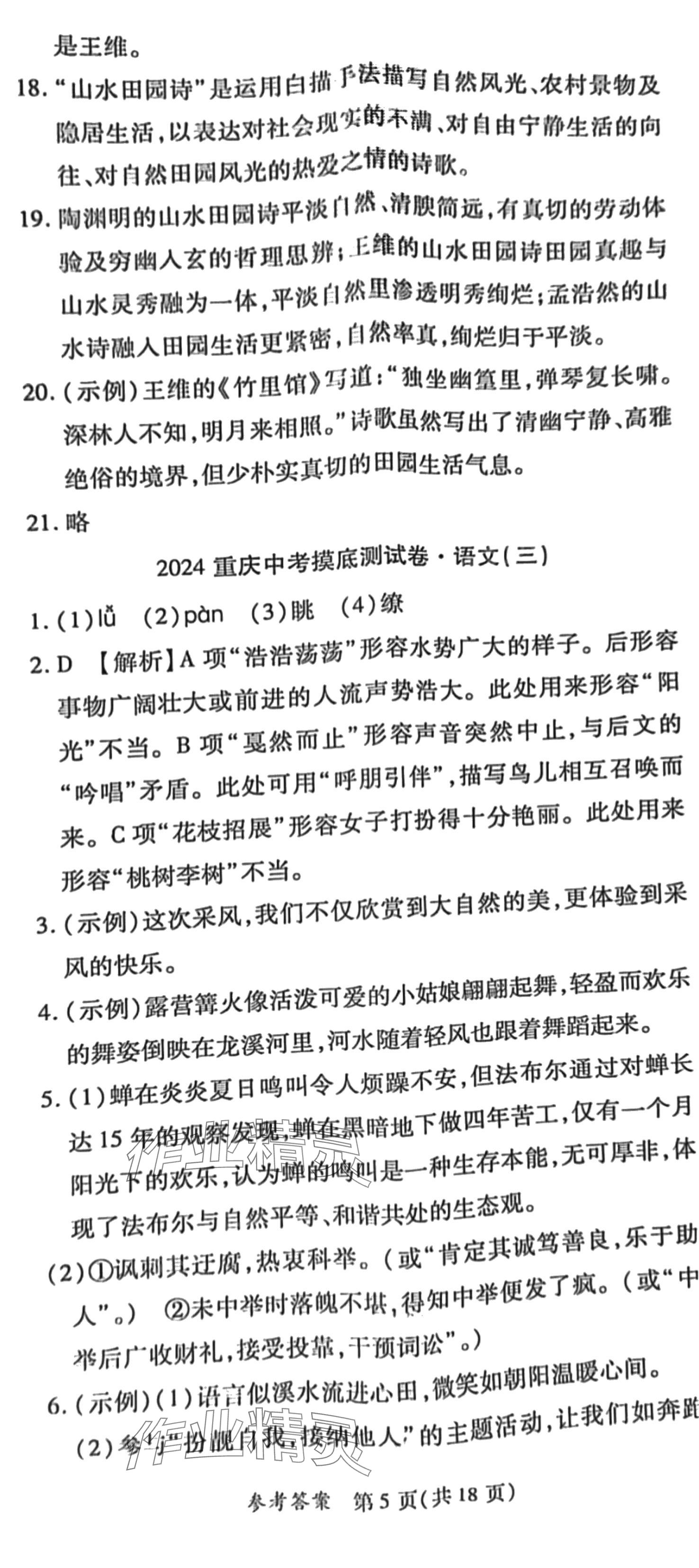 注:目前有些书本章节名称可能整理的还不是很完善,但都是按照顺序排列的,请同学们按照顺序仔细查找。练习册 2024年中考摸底测试卷重庆出版社语文 答案主要是用来给同学们做完题方便对答案用的,请勿直接抄袭。