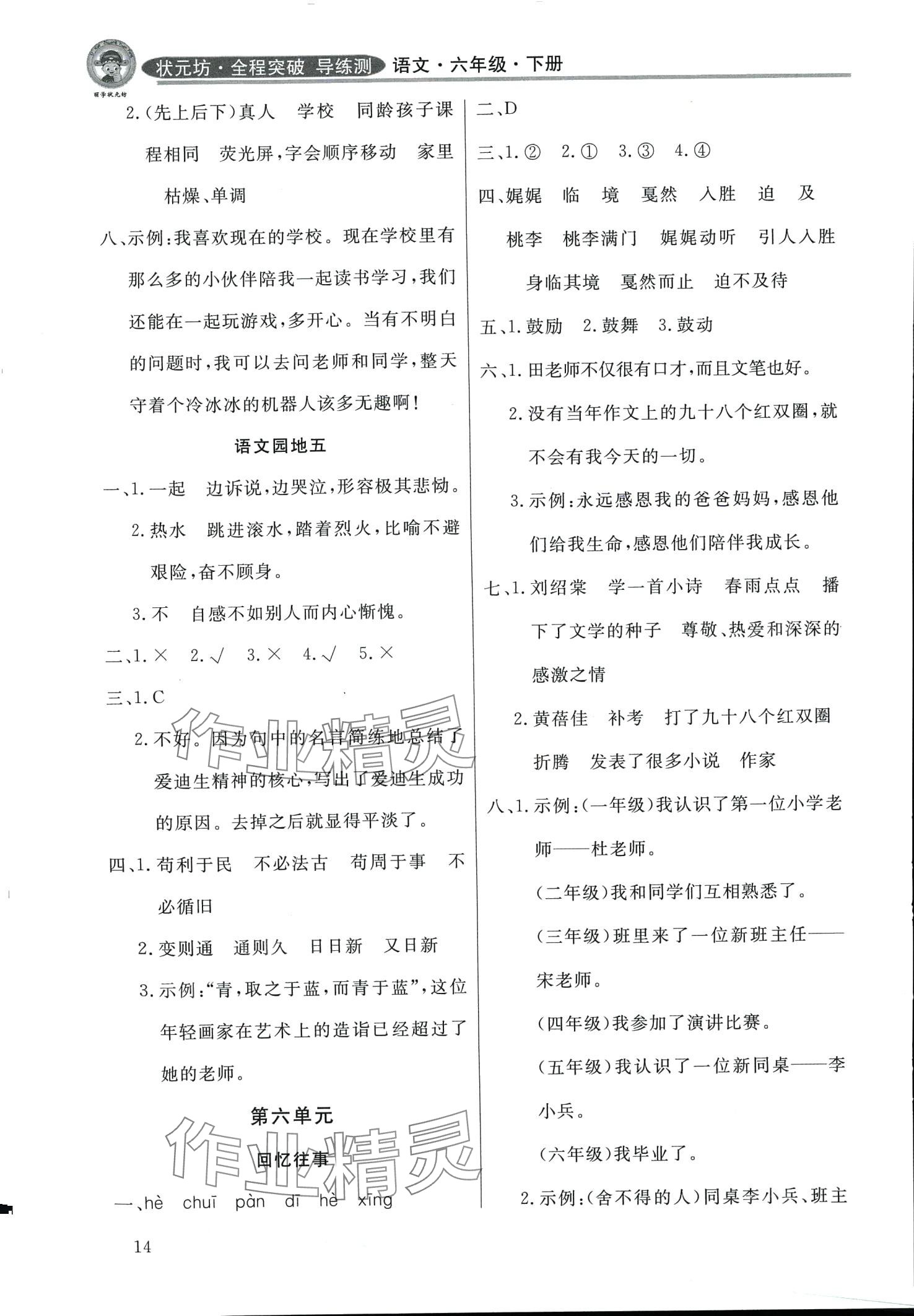 注:目前有些书本章节名称可能整理的还不是很完善,但都是按照顺序排列的,请同学们按照顺序仔细查找。练习册 2024年状元坊全程突破导练测六年级语文下册东莞专版 答案主要是用来给同学们做完题方便对答案用的,请勿直接抄袭。