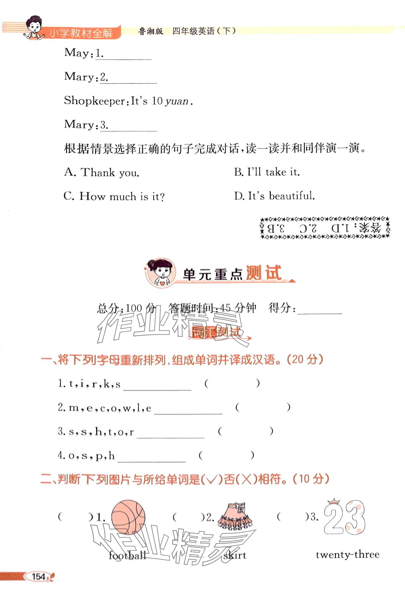 注:目前有些书本章节名称可能整理的还不是很完善,但都是按照顺序排列的,请同学们按照顺序仔细查找。练习册 2024年教材课本四年级英语下册湘鲁教版 答案主要是用来给同学们做完题方便对答案用的,请勿直接抄袭。