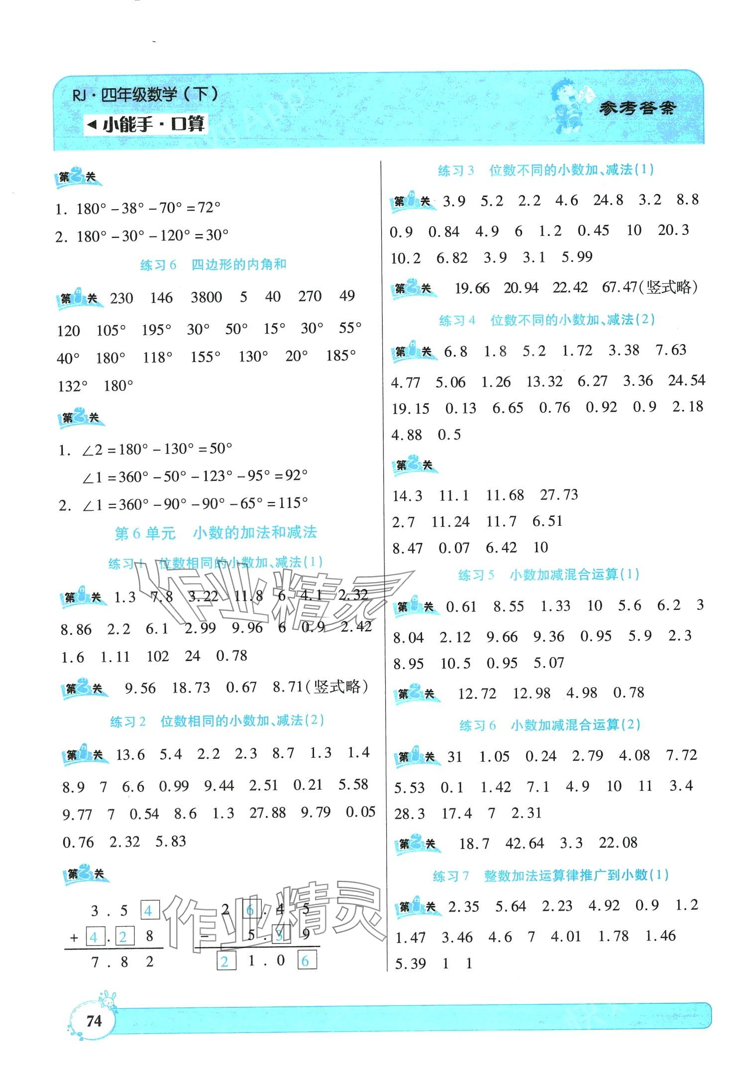 注:目前有些书本章节名称可能整理的还不是很完善,但都是按照顺序排列的,请同学们按照顺序仔细查找。练习册 2024年小能手口算四年级数学下册人教版 答案主要是用来给同学们做完题方便对答案用的,请勿直接抄袭。