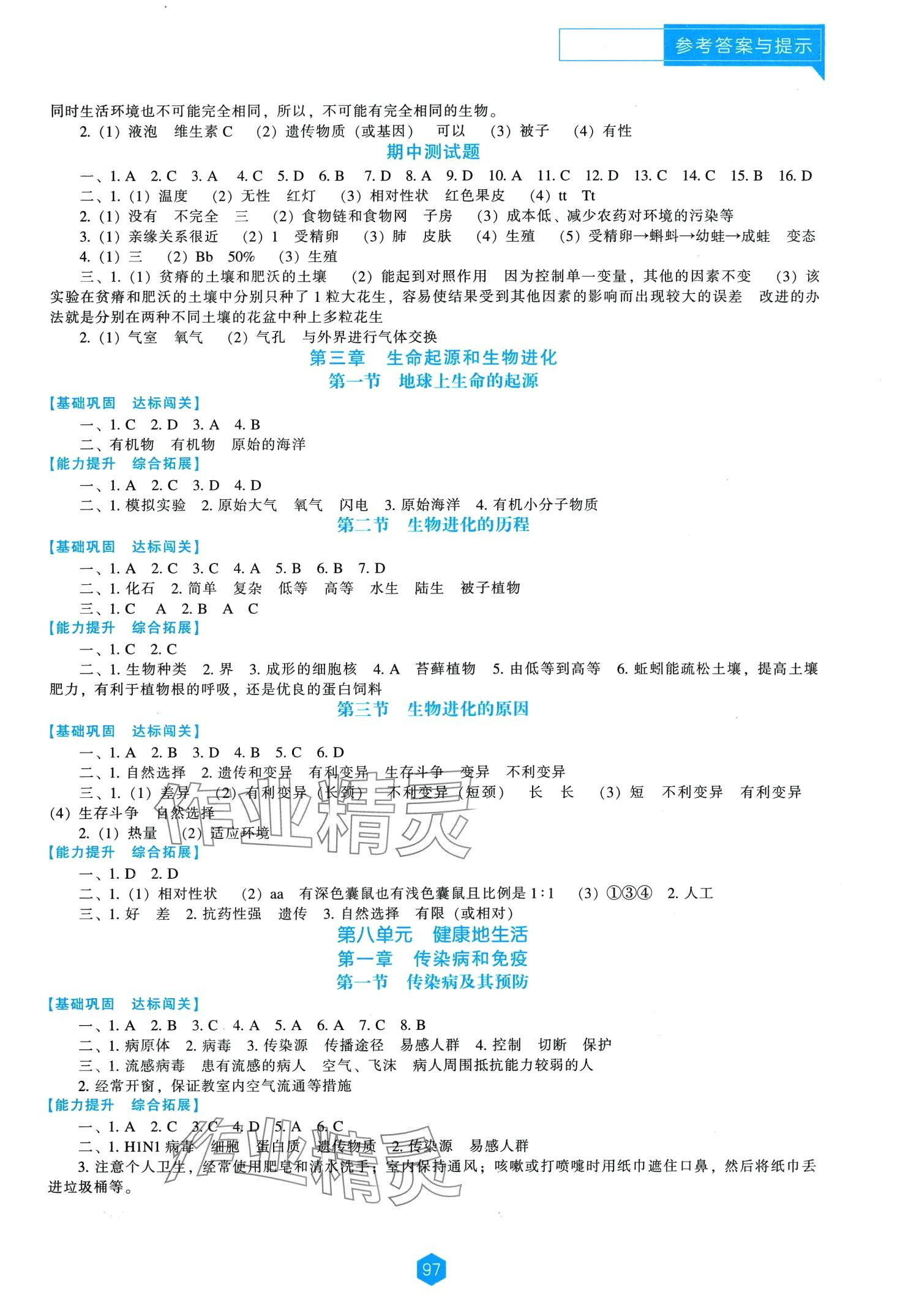 注:目前有些书本章节名称可能整理的还不是很完善,但都是按照顺序排列的,请同学们按照顺序仔细查找。练习册 2024年新课程能力培养八年级生物下册人教版 答案主要是用来给同学们做完题方便对答案用的,请勿直接抄袭。