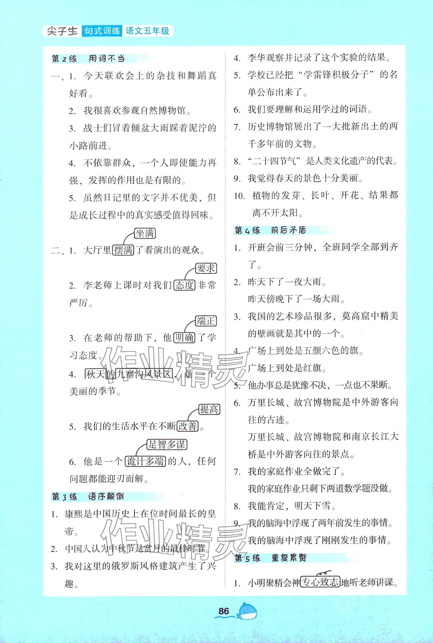 注:目前有些书本章节名称可能整理的还不是很完善,但都是按照顺序排列的,请同学们按照顺序仔细查找。练习册 2024年尖子生句式训练五年级语文全一册人教版 答案主要是用来给同学们做完题方便对答案用的,请勿直接抄袭。