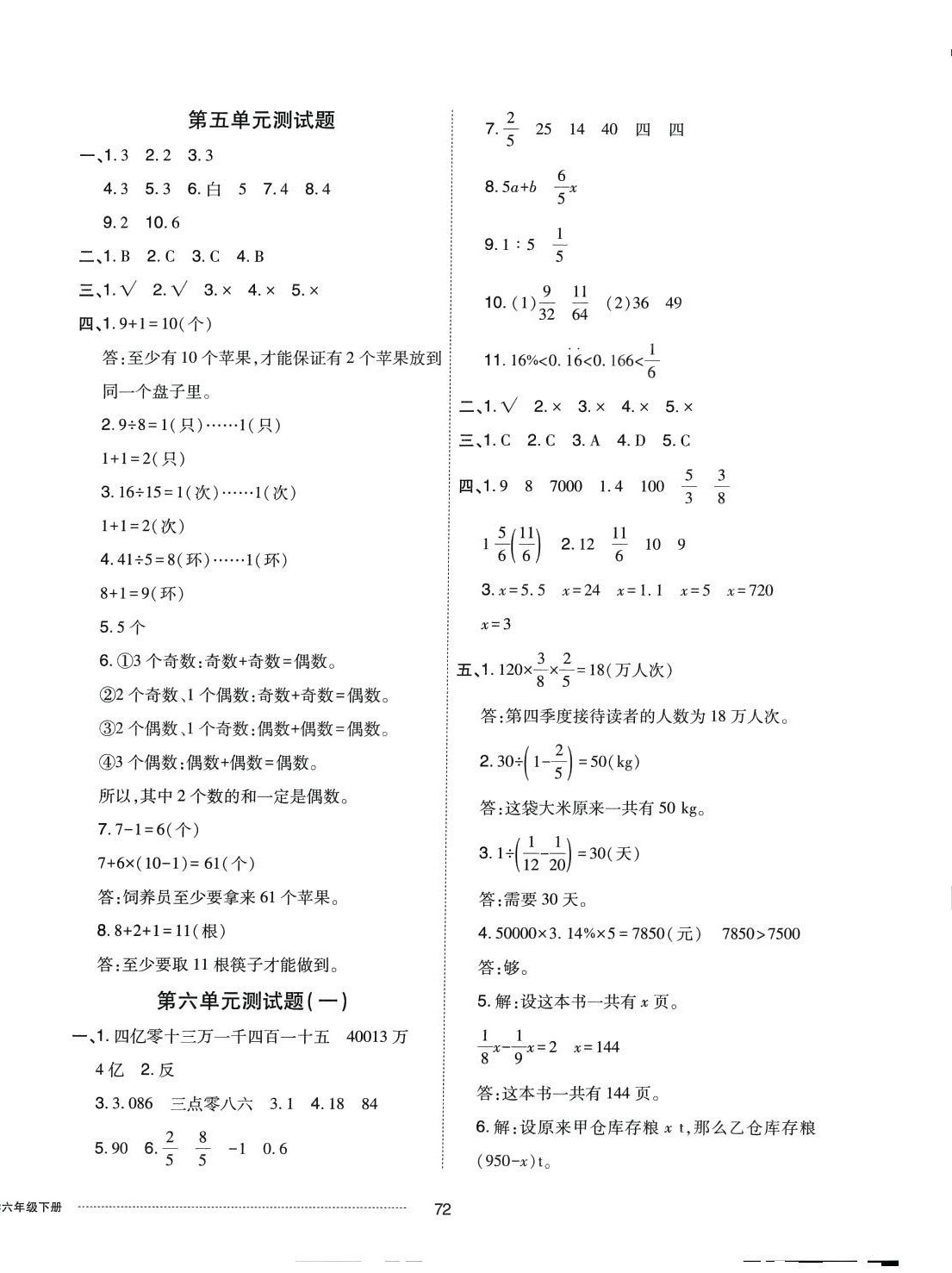 注:目前有些书本章节名称可能整理的还不是很完善,但都是按照顺序排列的,请同学们按照顺序仔细查找。练习册 2024年同步练习册配套单元自测卷六年级数学下册人教版 答案主要是用来给同学们做完题方便对答案用的,请勿直接抄袭。