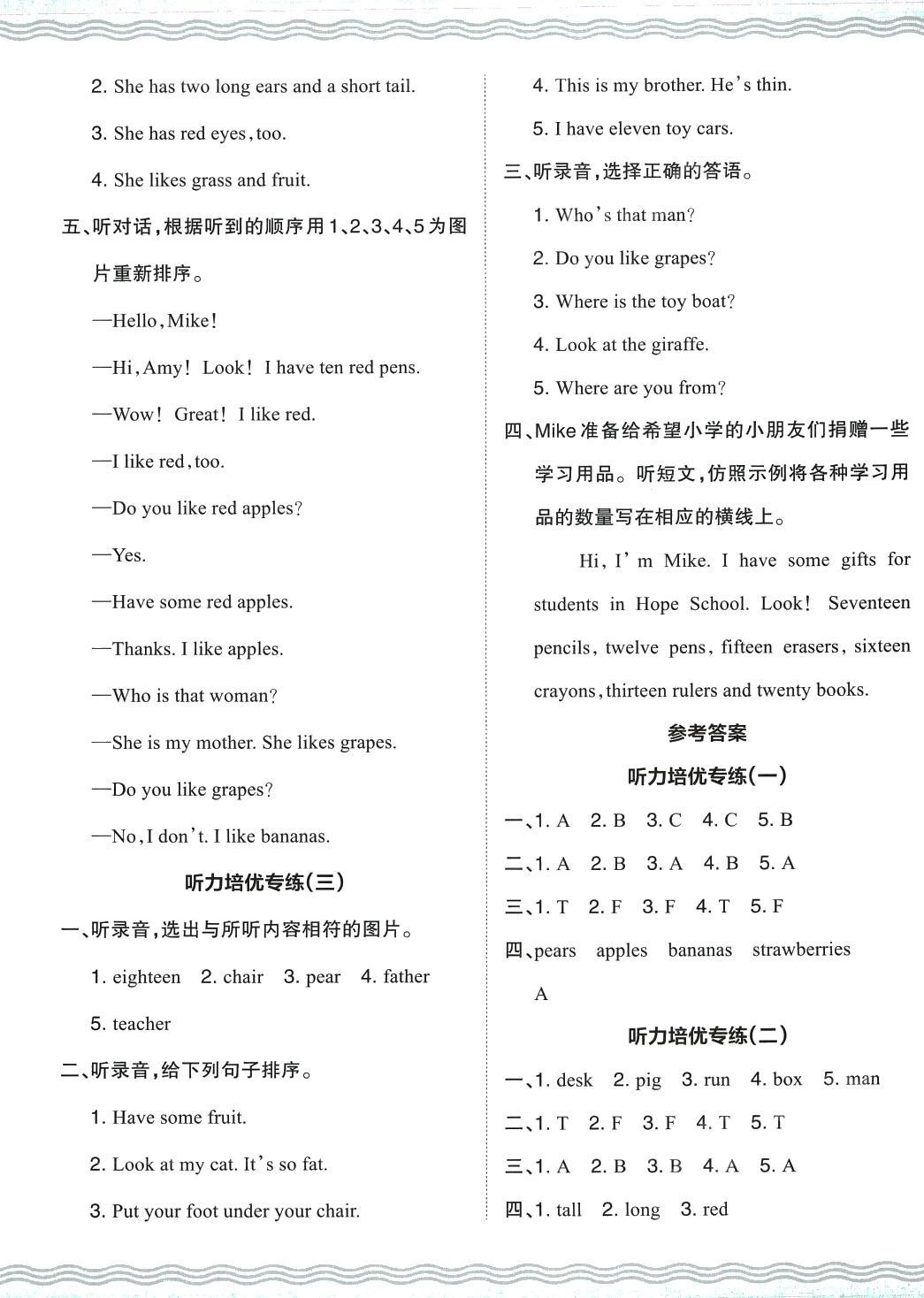 注:目前有些书本章节名称可能整理的还不是很完善,但都是按照顺序排列的,请同学们按照顺序仔细查找。练习册 2024年王朝霞培优100分三年级英语下册人教版 答案主要是用来给同学们做完题方便对答案用的,请勿直接抄袭。