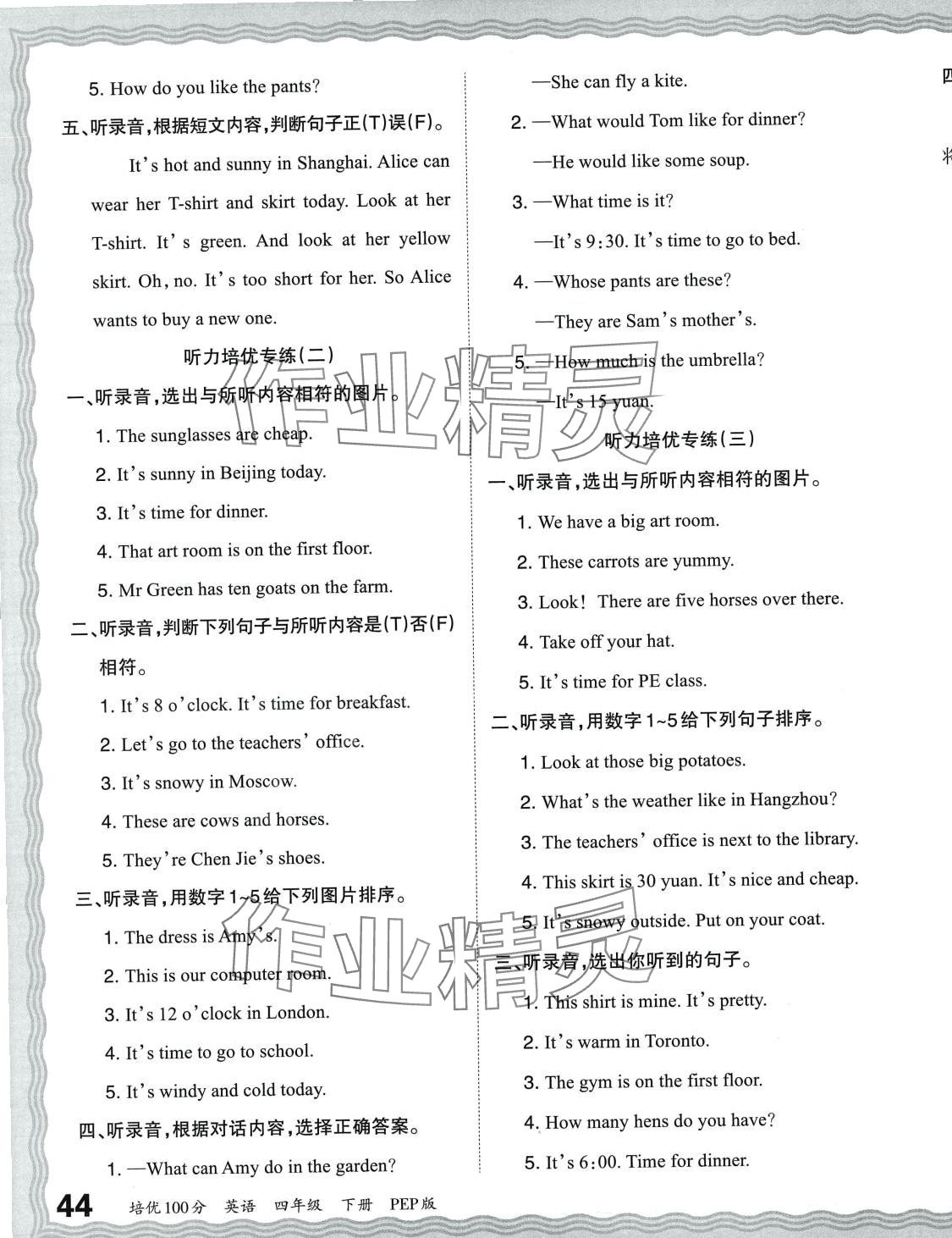 注:目前有些书本章节名称可能整理的还不是很完善,但都是按照顺序排列的,请同学们按照顺序仔细查找。练习册 2024年王朝霞培优100分四年级英语下册人教版 答案主要是用来给同学们做完题方便对答案用的,请勿直接抄袭。