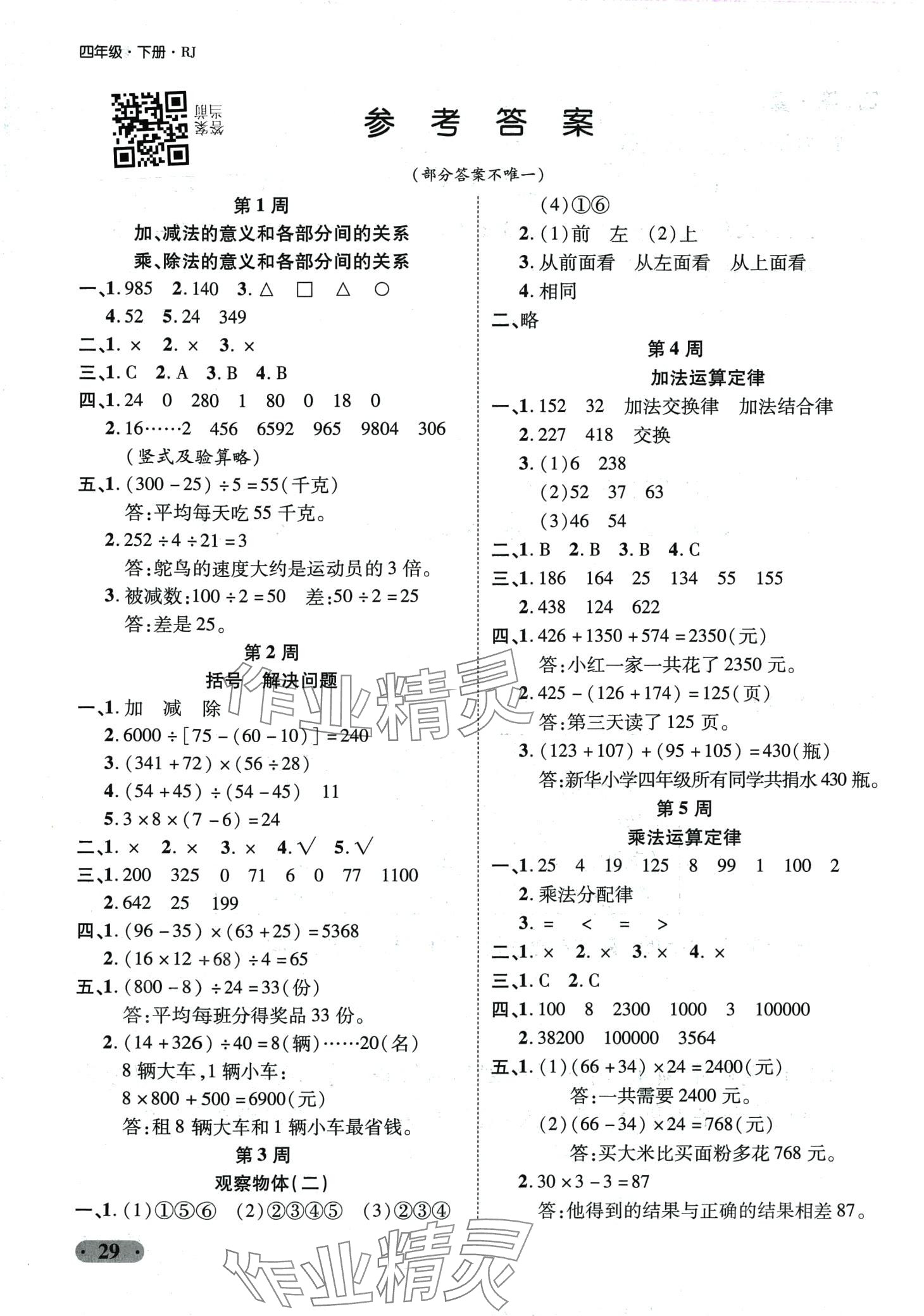 注:目前有些书本章节名称可能整理的还不是很完善,但都是按照顺序排列的,请同学们按照顺序仔细查找。练习册 2024年一卷通小学核心素养评价四年级数学下册人教版 答案主要是用来给同学们做完题方便对答案用的,请勿直接抄袭。