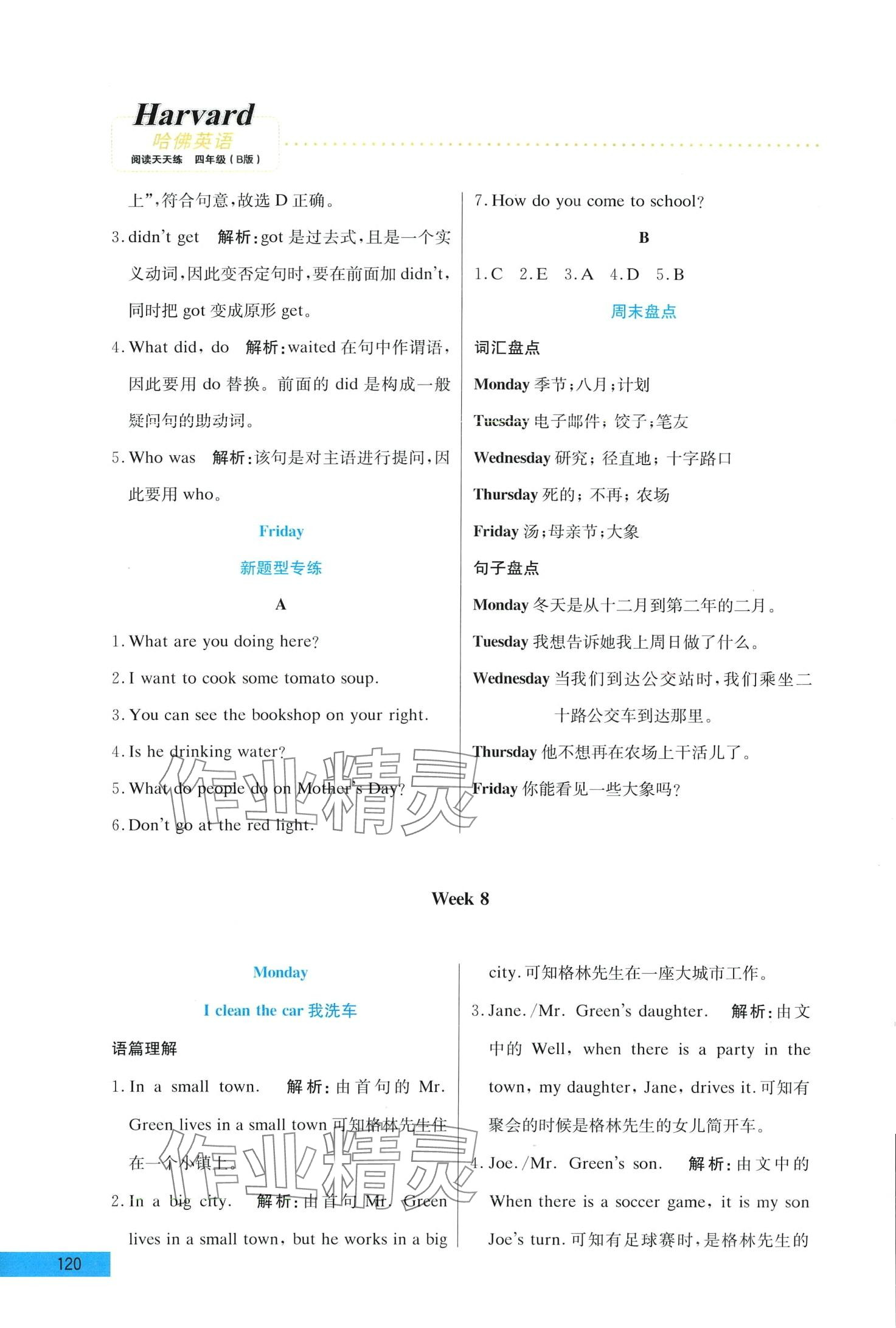 注:目前有些书本章节名称可能整理的还不是很完善,但都是按照顺序排列的,请同学们按照顺序仔细查找。练习册 2024年哈佛英语阅读天天练四年级B版 答案主要是用来给同学们做完题方便对答案用的,请勿直接抄袭。