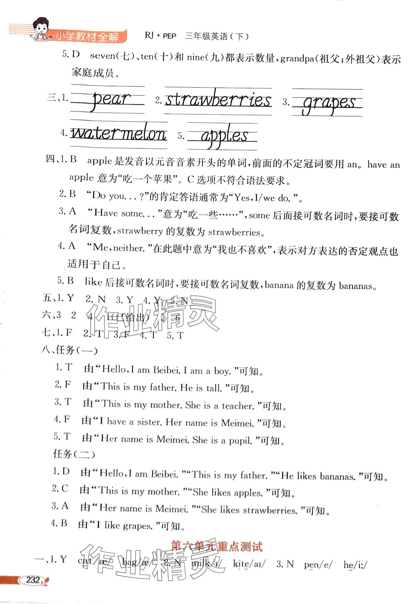 注:目前有些书本章节名称可能整理的还不是很完善,但都是按照顺序排列的,请同学们按照顺序仔细查找。练习册 2024年教材全解三年级英语下册人教PEP版 答案主要是用来给同学们做完题方便对答案用的,请勿直接抄袭。