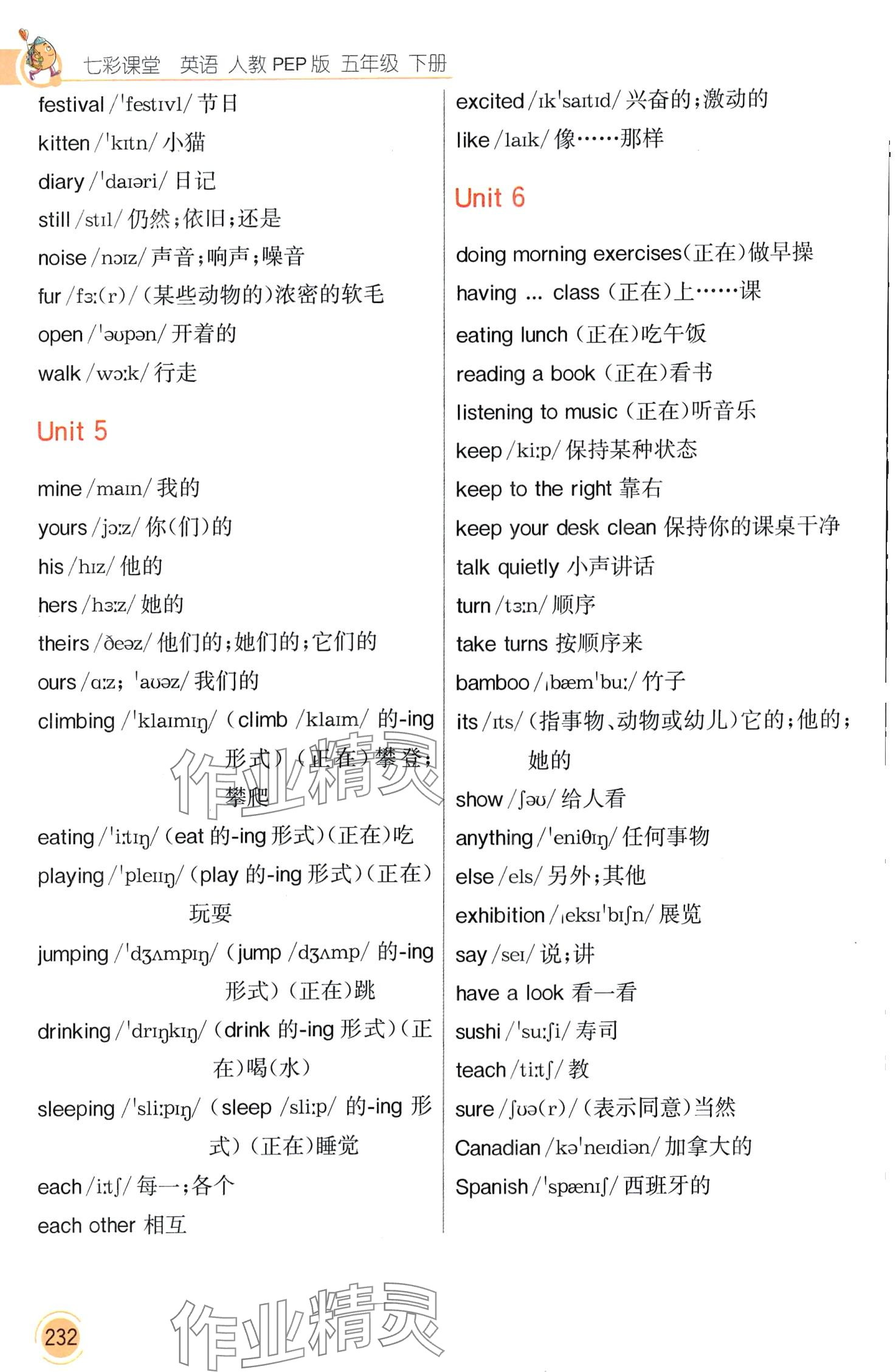 注:目前有些书本章节名称可能整理的还不是很完善,但都是按照顺序排列的,请同学们按照顺序仔细查找。练习册 2024年七彩课堂五年级英语下册人教版 答案主要是用来给同学们做完题方便对答案用的,请勿直接抄袭。