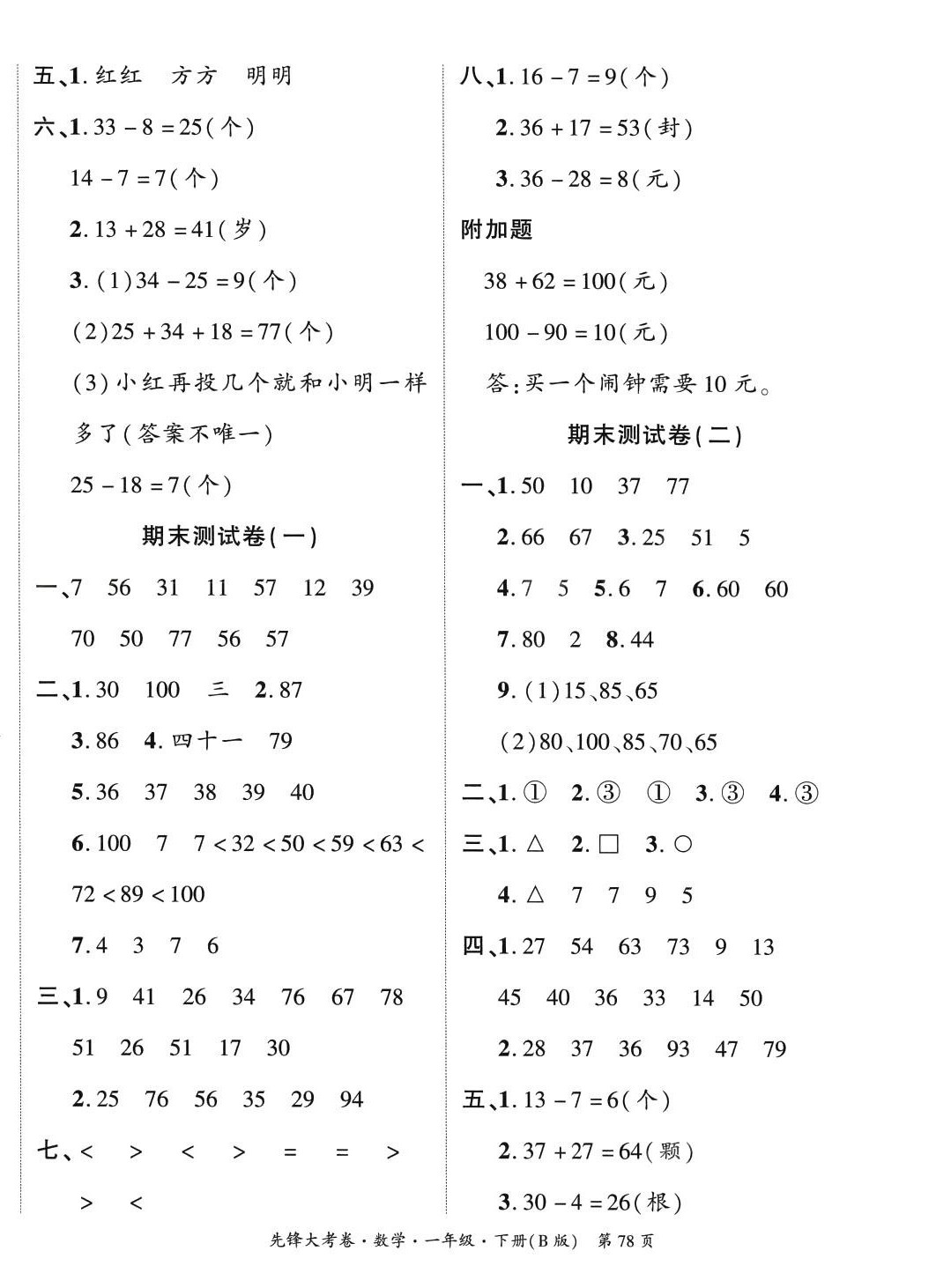 注:目前有些书本章节名称可能整理的还不是很完善,但都是按照顺序排列的,请同学们按照顺序仔细查找。练习册 2024年单元加期末复习先锋大考卷一年级数学下册北师大版 答案主要是用来给同学们做完题方便对答案用的,请勿直接抄袭。