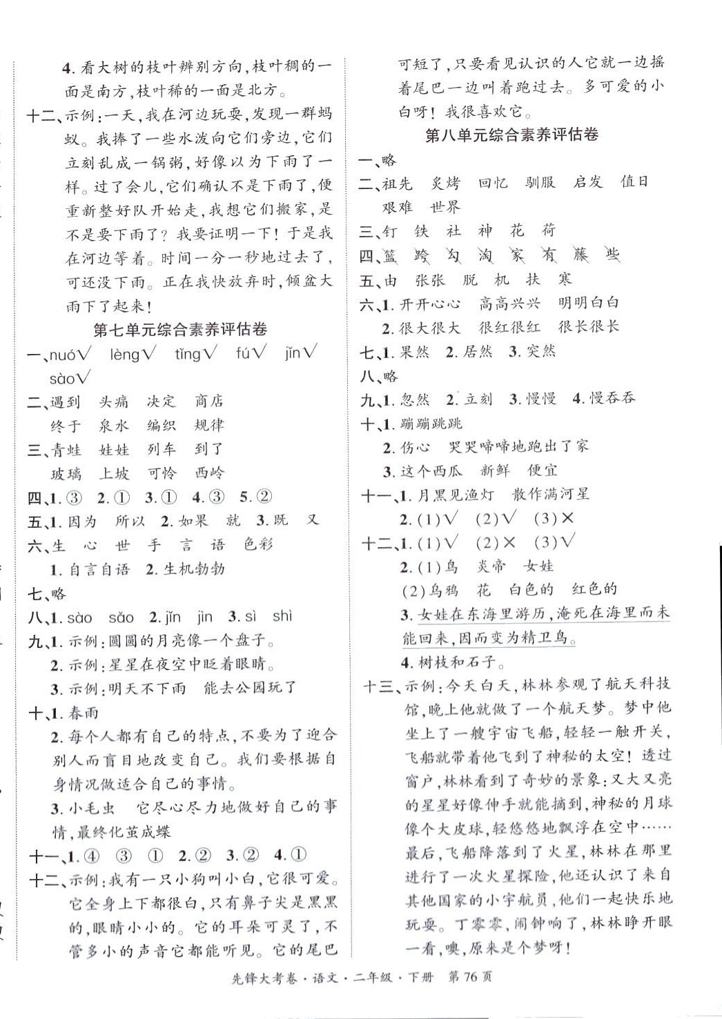 注:目前有些书本章节名称可能整理的还不是很完善,但都是按照顺序排列的,请同学们按照顺序仔细查找。练习册 2024年单元加期末复习先锋大考卷二年级语文下册人教版 答案主要是用来给同学们做完题方便对答案用的,请勿直接抄袭。