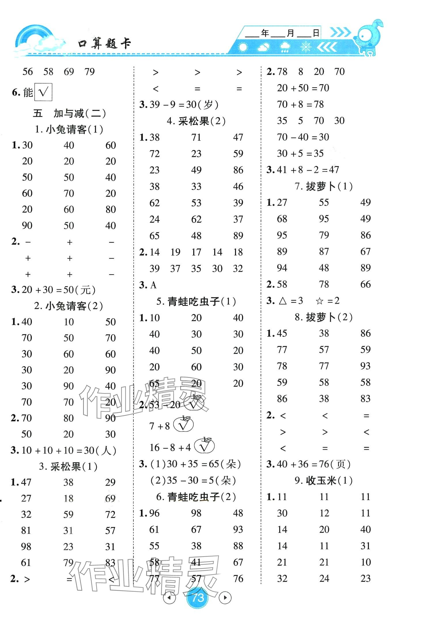 注:目前有些书本章节名称可能整理的还不是很完善,但都是按照顺序排列的,请同学们按照顺序仔细查找。练习册 2024年小状元数学天天练口算题卡大通关一年级下册北师大版 答案主要是用来给同学们做完题方便对答案用的,请勿直接抄袭。